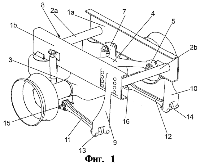 На фиг.1 изображена предложенная подвеска моста на шасси грузового автомобиля (подробно не изображен), имеющем продольные балки (лонжероны) 1а и 1b. Продольные балки 1а и 1b расположены на расстоянии друг от друга в поперечном направлении и жестко соединены друг с другом поперечинами 2а и 2b. Под продольными балками 1а и 1b расположен мост 3 автомобиля, который соединяется с продольными балками 1а и 1b через рычаг 4 четырехточечной подвески. Рычаг 4 четырехточечной подвески имеет в общей сложности четыре шарнира 5, 6, 7 и 8, причем два шарнира 5 и 6 закреплены на раме автомобиля, и два шарнира 7 и 8 – на мосту автомобиля. Шарниры, установленные на мосту автомобиля и на его кузове, разнесены поперек продольной оси автомобиля.