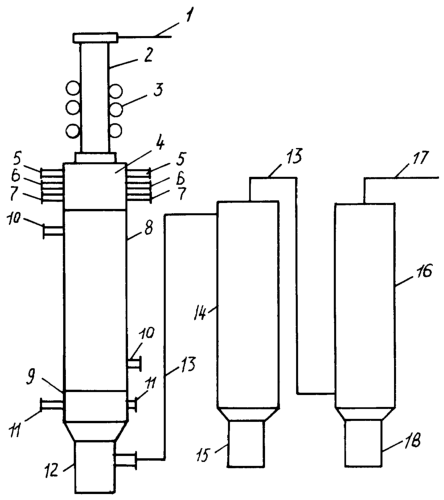 Полное превращение конечного продукта происходит в реакторе 8, внутри которого установлена водоохлаждаемая решетка 9, а охлаждение реактора и решетки осуществляется подачей воды через патрубки 10 и 11 соответственно. Причем охлажденные твердые частицы алюминия хлорида частично оседают и поступают в накопительный бункер 12, остальная же часть через газоходы 13 улавливается циклоном 14 с установленным под ним бункером 15 и фильтром 16, где происходит окончательное улавливание частиц алюминия хлорида, при этом отходящий газ по газопроводу 17 направляется на утилизацию остаточного хлора, а конечный продукт в виде частиц алюминия хлорида скапливается в бункере 18.