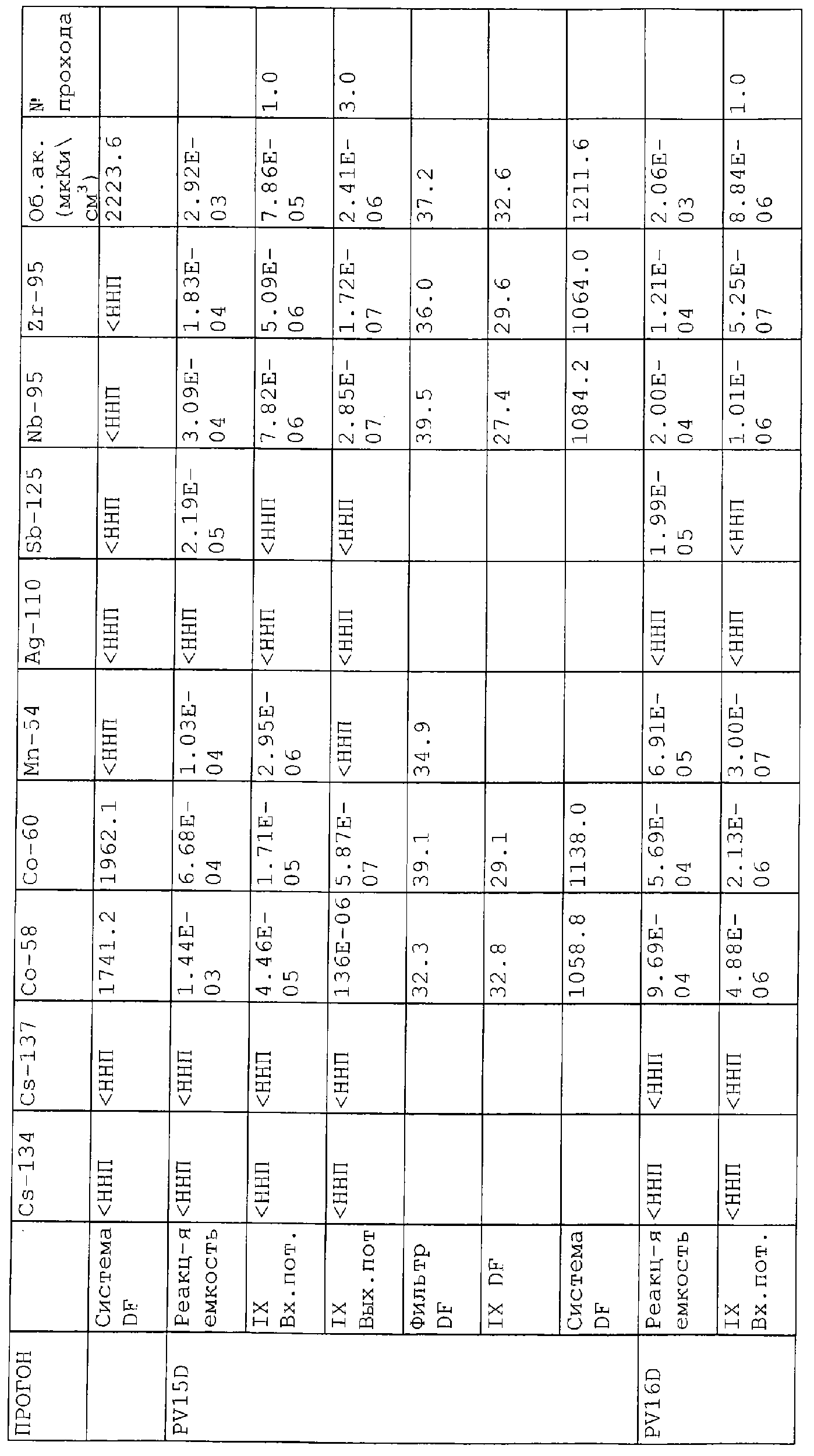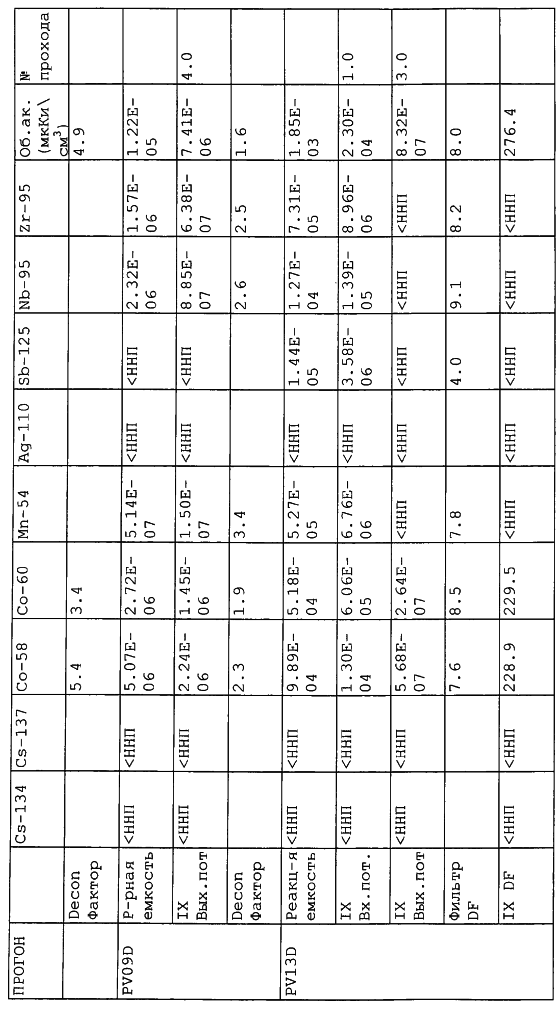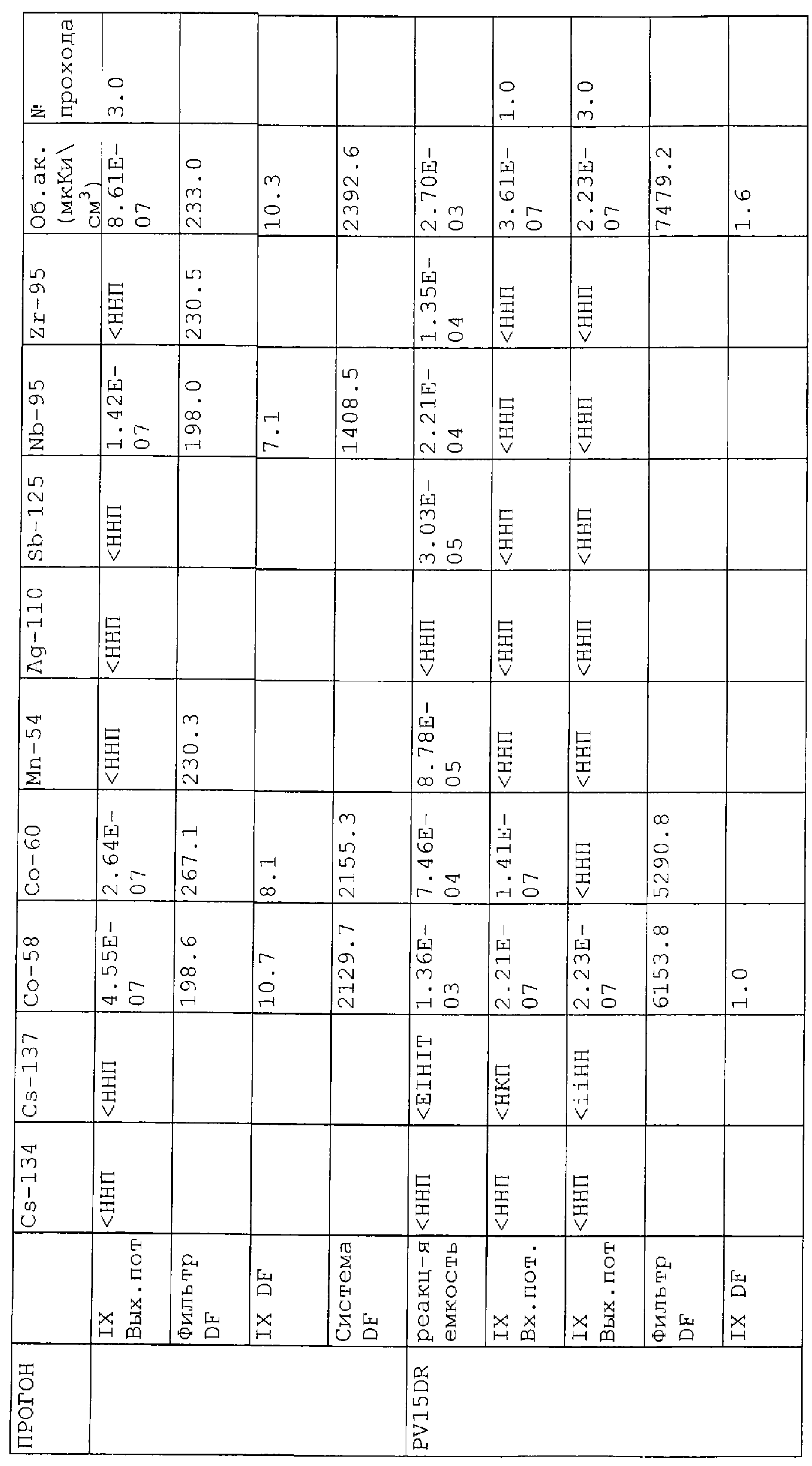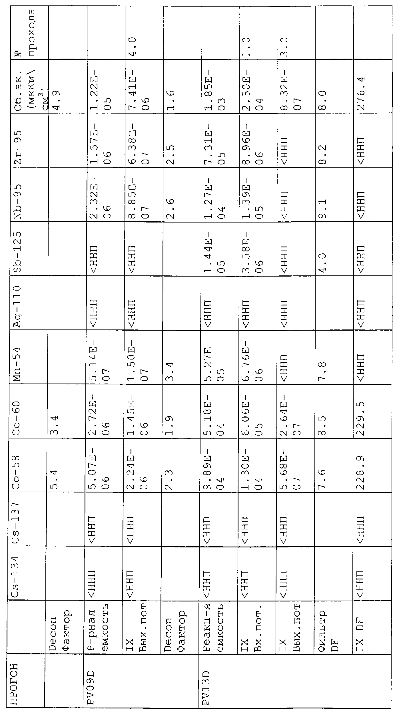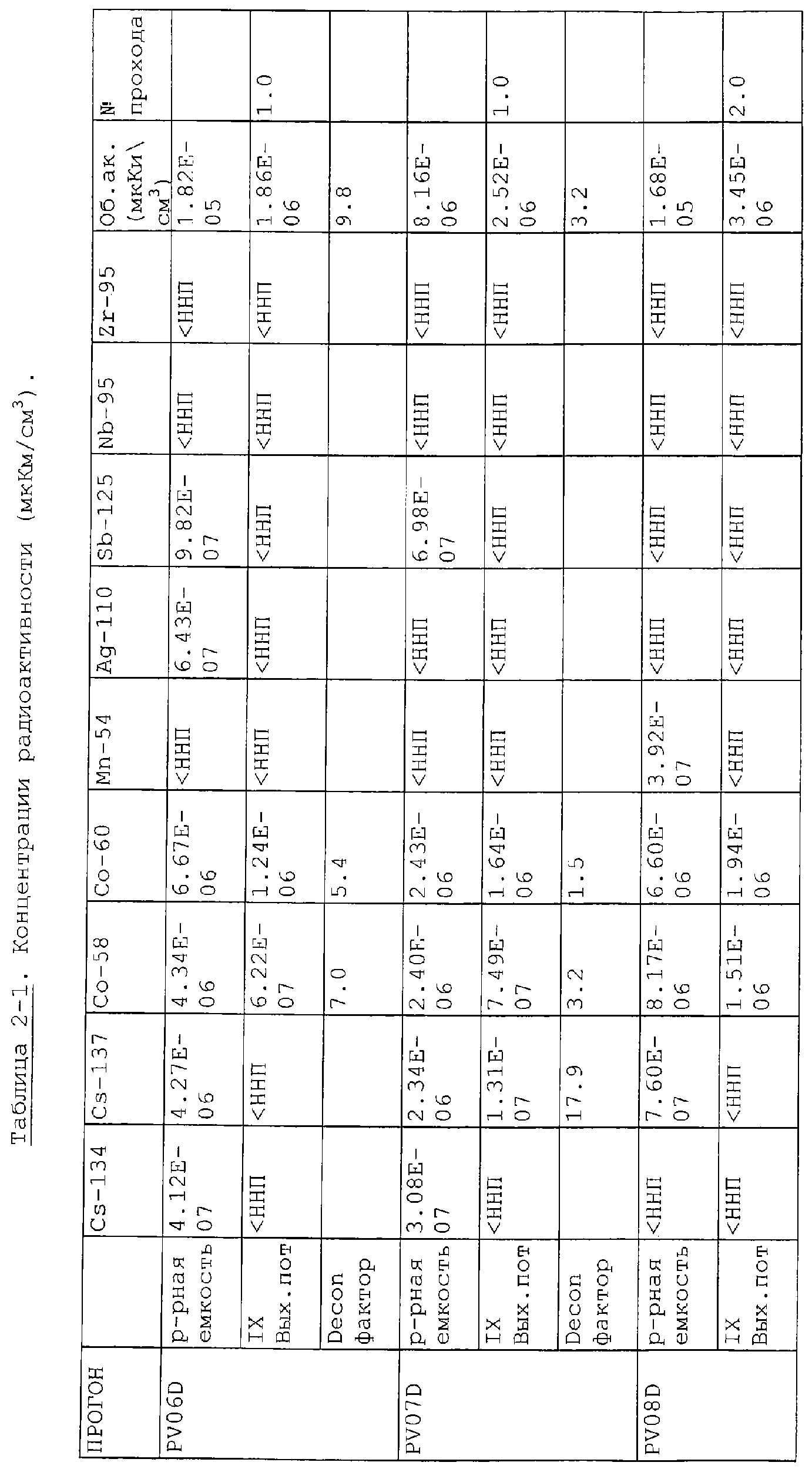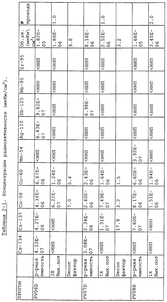 Другой важной фазой крупномасштабного испытания является изучение способности данного способа удалять радиоактивное загрязнение из обработанного сбросового потока ПВС. На данной стадии прореагировавший сбросовый поток, содержащий радиоактивные загрязнения, прокачивают насосом из растворного реактора через ряд микронных фильтров и слои ионообменной смолы, затем рециркулируют обратно в растворный реактор. Между каждой стадией указанного способа отбирают пробы для определения, когда и в какой степени удалены радиоактивные изотопы. Результаты анализа приведены в таблице 2-1. Стандартными единицами измерения концентрации радиоактивности являются микрокюри на кубический сантиметр (мкКи/см3). Коэффициент очистки (Decon-фактор) является общеиспользуемым термином для выражения эффективности утилизации фильтрационной среды. Он определяется делением входной концентрации на выходную концентрацию. Например, если входная концентрация равна 100 мкКи/см3, а выходная концентрация равна 10 мкКи/см3, тогда Decon-фактор равен 10. Буквенно-цифровые символы в шапке таблицы 2-1 являются стандартной химической номенклатурой для различных химических изотопов, присутствующих и рассматриваемых в данном случае. Цифра представляет число атомной массы для элемента. Decon-фактор равен активности реактора, деленной на активность выходящего потока IX. “LLD” (ННП) представляет активность уровня ниже нижнего предела определения.