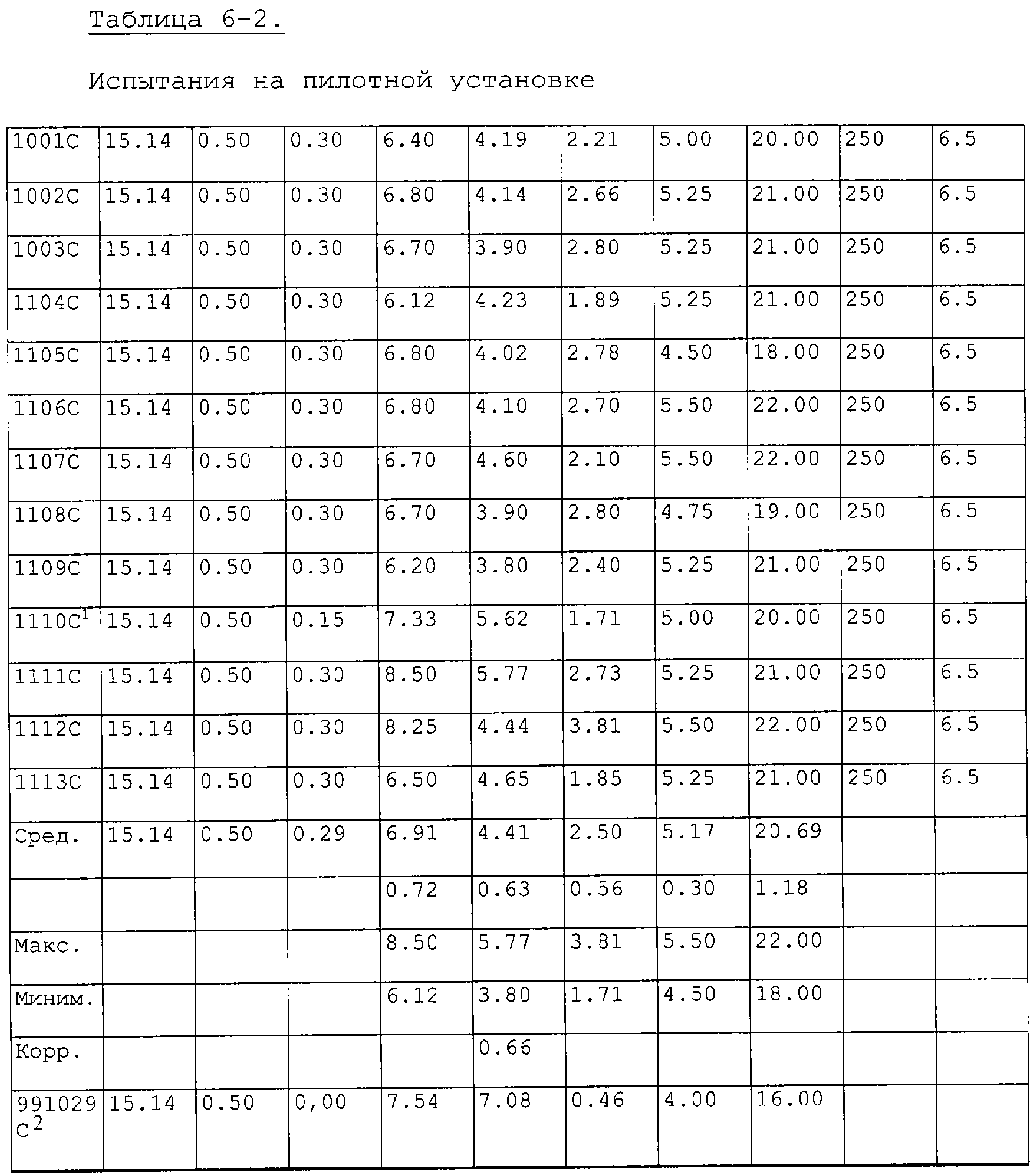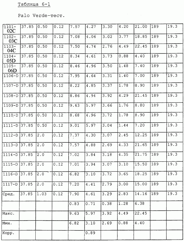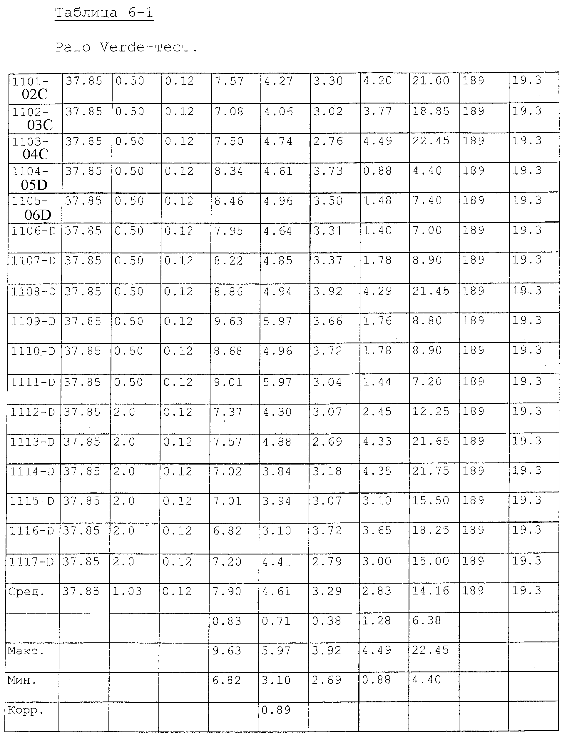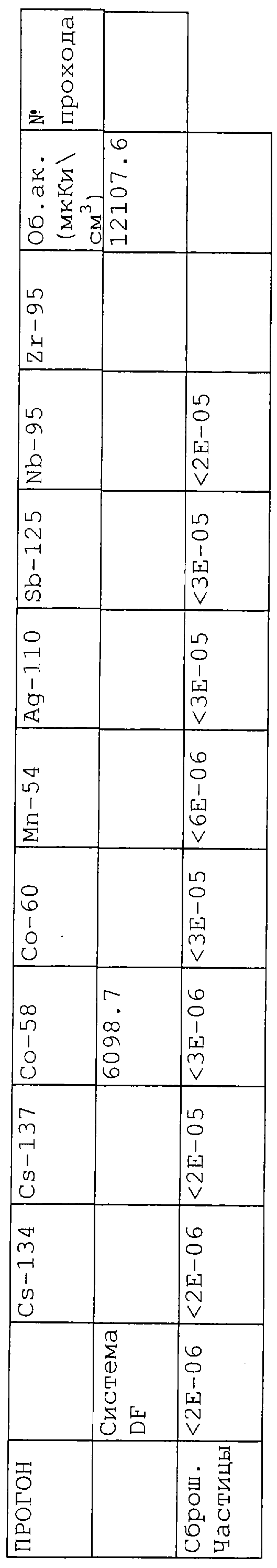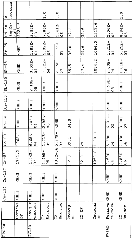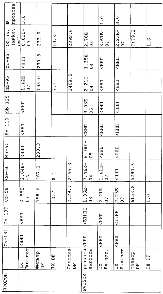 Другой важной фазой крупномасштабного испытания является изучение способности данного способа удалять радиоактивное загрязнение из обработанного сбросового потока ПВС. На данной стадии прореагировавший сбросовый поток, содержащий радиоактивные загрязнения, прокачивают насосом из растворного реактора через ряд микронных фильтров и слои ионообменной смолы, затем рециркулируют обратно в растворный реактор. Между каждой стадией указанного способа отбирают пробы для определения, когда и в какой степени удалены радиоактивные изотопы. Результаты анализа приведены в таблице 2-1. Стандартными единицами измерения концентрации радиоактивности являются микрокюри на кубический сантиметр (мкКи/см3). Коэффициент очистки (Decon-фактор) является общеиспользуемым термином для выражения эффективности утилизации фильтрационной среды. Он определяется делением входной концентрации на выходную концентрацию. Например, если входная концентрация равна 100 мкКи/см3, а выходная концентрация равна 10 мкКи/см3, тогда Decon-фактор равен 10. Буквенно-цифровые символы в шапке таблицы 2-1 являются стандартной химической номенклатурой для различных химических изотопов, присутствующих и рассматриваемых в данном случае. Цифра представляет число атомной массы для элемента. Decon-фактор равен активности реактора, деленной на активность выходящего потока IX. “LLD” (ННП) представляет активность уровня ниже нижнего предела определения.