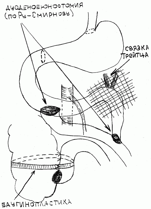 При расстоянии между аортой и верхней мезентериальной артерией на уровне нижнегоризонтальной части 12 ПК более 2 см производят рассечение связки Трейтца (РСТ), а в 2 см и менее – дуоденоеюностомию.