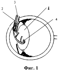 Изобретение осуществляется следующим образом. После удаления ядра хрусталика и хрусталиковых масс в капсульную сумку (1) через тоннельный разрез (2) вводится вискоэластик, через этот же разрез с помощью инжектора (3) в капсульную сумку (1) вводится искусственный имплантат глаза (4), выполненный из биологически инертного материала (фиг.1). Имплантат выполнен в форме незамкнутого кольца. Поверхность незамкнутого кольца снабжена, по крайней мере, 5 дугообразными выступами (5) (фиг.2), расположенными радиально и направленными к центру незамкнутого кольца. Дугообразные выступы (5) (фиг.2) расположены на одинаковом угловом расстоянии друг от друга, а свободный конец каждого дугообразного выступа заглушен. Свободные концы дугообразных выступов (5) не доходят до проекции центра и оставляют свободной центральную оптическую часть. Выпуклую часть незамкнутого кольца с дугоообразными выступами направляют в сторону задней капсулы хрусталика (1), придавая ей необходимую конфигурацию. После введения искусственного имплантата имплантируют эластичную интраокулярную линзу (6) (фиг.3) требуемой диоптрийности с помощью инжектора, не расширяя тоннельный разрез. Вискоэластик удаляется из полости глаза. Передняя камера восстанавливается сбалансированным физиологическим раствором. Швы не накладываются.