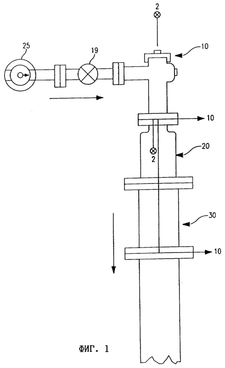Ниже со ссылкой на соответствующие чертежи, на которых одни и те же или равнозначные детали обозначены одинаковыми позициями, описан один из вариантов возможного выполнения предлагаемого в изобретении редуцирующего давление нефти устройства, которое может быть смонтировано в устье нефтяной скважины высокого давления. На чертежах стрелками показано направление потока нефти, протекающей через сборное редукционное устройство из скважины в трубопровод, идущий к оборудованию для переработки нефти. Показанный на чертеже редукционный клапан 10 соединен через запорный клапан 19 с коллектором 25 устья скважины. Нижний фланец редукционного клапана 10 соединен с первым фланцевым переходником 20, который в свою очередь соединен со вторым фланцевым переходником 30. Второй переходник 30 соединен с трубопроводом, ведущим к оборудованию для переработки нефти (не показано).