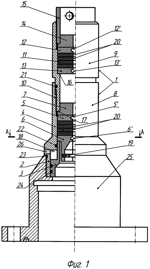 Корпус 1 с гидроцилиндром 2, поршнем 3, регулировочным винтом 15 через переводник 25 герметично крепится к устьевой арматуре (не показана). Геофизический кабель (не показан) со спускаемым оборудованием (не показано) на конце пропускается через корпус 1, гидроцилиндр 2 с поршнем 3 и переводник 25 в скважину. Затем сверху в нижнюю часть 8 корпуса 1 последовательно вставляют разъемные нижнее кольцо 6 (состоящее из двух частей 6 и 6′ см. Фиг.2) с ловителем 19 (например: подпружиненное кольцо) (см. Фиг.1) до упора на поршень 3, уплотнительный элемент 4, верхнее кольцо 5 (5 и 5′) и упор 7 (7 и 7′). Все вставляемые в нижнюю часть 8 корпуса 1 элементы 6, 4, 5 и 7 предварительно поджимают через упор 7 верхней кромкой 17 верхней части 9 корпуса 1. Далее сверху в верхнюю часть 9 корпуса 1 последовательно вставляют дополнительные разъемные нижнее кольцо 13 (состоящее из двух частей 13 и 13′) до упора на ограничитель 16, уплотнительный элемент 11, верхнее кольцо 12 (12 и 12′) и упор 14 (14 и 14′). Все вставляемые в верхнюю часть 8 корпуса 1 элементы 13, 11, 12 и 14 поджимают через упор 14 полым регулировочным винтом 15 до соприкосновения дополнительного уплотнительного элемента 11 с геофизическим кабелем, благодаря чему исключается излив внутрискважинной жидкости (выделение газа) через дополнительный уплотнительный элемент 11 во время спуска в требуемый интервал скважины оборудования, прикрепленного к геофизическому кабелю. Во время эксплуатации в скважине могут происходить спонтанные или вызванные работой оборудования всплески внутрискважинного давления, которое действует на полый поршень 3, заставляя перемещаться его вверх благодаря тому, что надпоршневая полость 18 гидроцилиндра 2 при помощи канала 26 сообщается с наружным пространством устройства, прижимая через нижнее кольцо 8 уплотнительный элемент 4 к геофизическому кабелю. В результате происходит дополнительная изоляция и исключается излив внутрискважинной жидкости (выделение газа) на устье при перепадах внутрискважинного давления. При износе дополнительного уплотнительного элемента 11 достаточно поджать его регулировочным полым винтом 15 через дополнительные упор 14 и направляющее кольцо 12, чтобы не нарушать герметизацию устья. В случаях частых скачков внутрискважинного давления происходит усиленный износ уплотнительного элемента 4, чтобы уменьшить увеличенный зазор, вызванный износом, уплотнительный элемент 4 поджимают через упор 7 и верхнее направляющее кольцо 5 нижней кромкой 17 верхней части 9 корпуса 1, благодаря регулировочной резьбе 10. В случаях критического износа, который нельзя выбрать за счет полого регулировочного винта 15, дополнительного уплотнительного элемента 11 (так как он несет основную нагрузку при изоляции геофизического кабеля), его заменяют, не извлекая спускаемого оборудования в следующей последовательности: