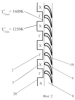 На фиг.2 показана условная эпюра распределения температуры потока перед сопловым аппаратом второй ступени, имеющегося при периодической неравномерности потока за трубчато-кольцевыми камерами сгорания.