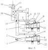 На взлетном режиме (фиг.5) подвод охлаждающего воздуха к сопловому аппарату второй ступени 8, ко всем сопловым лопаткам 9 и 10, из магистрального канала 19 осуществляется при полностью открытом кране 17 и полностью открытом кране 15. Таким образом, через коллекторы 11 и 12, патрубки 13 и 14, в лопатки 9 и 10 охлаждающий воздух будет поступать в количестве, необходимом для высокотемпературного взлетного режима.