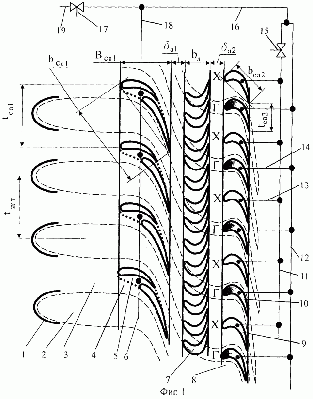 Охлаждаемая двухступенчатая турбина ГТД с трубчато-кольцевой камерой сгорания, жаровые трубы 1 которых условно показаны на фиг.1, имеет охлаждаемый сопловой аппарат 4 первой ступени с равномерно установленными против промежутков жаровых труб двухрядными лопатками 5, имеющими общий коллектор подвода охладителя 6, рабочее колесо турбины 7 первой ступени, сопловой аппарат второй ступени 8, на котором равномерно установлены одинаковые лопатки 9 и 10 с одинаковым конвективным охлаждением и одинаковой хордой bca2 профиля; весь сопловой аппарат 8 второй ступени установлен относительно соплового аппарата 4 первой ступени с окружным смещением, все нечетные лопатки 9 присоединены к одному общему коллектору 11 подвода охлаждающего воздуха, который имеет дроссельный кран 15 для отсечки коллектора, а все четные лопатки 10 присоединены к другому общему коллектору 12 подвода охлаждающего воздуха. Оба коллектора 11 и 12 присоединены к системе подачи охладителя (охлаждающего воздуха) 16, на которой установлен дроссельный кран 17. Вся сеть системы охлаждения двухступенчатой турбины ГТД питается от системы охлаждения двигателя через магистральный канал 19.