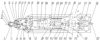 По внешней поверхности двигателя по всей длине смесительной камеры 23 и длине прибора преобразования энергии от осевого воздушного компрессора 34 и вентилятора 35 установлены трубный воздуховод 30 низкого давления и трубный воздуховод 31 высокого давления. За газовоздушной турбиной 26 на валу генератора тока установлены гидравлические насосы: насос масляный 32 и насос топливный 33.