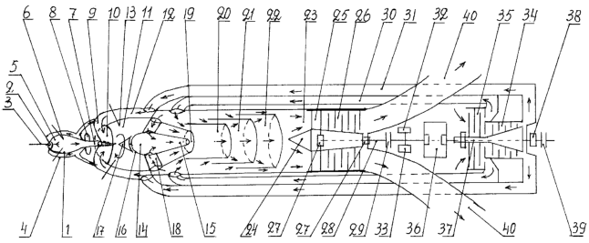 На задней части двигателя установлен осевой воздушный компрессор 34 высокого давления и вентилятора 35 низкого давления. Генератор тока 36, выполняющий так же функции стартера, с одной стороны через автоматическую муфту сцепления 29 соединен с газовоздушной турбиной 26, с другой стороны соединен с валом 37 осевого воздушного компрессора 34 и вентилятором 35 низкого давления. На одном валу 37 с осевым воздушным компрессором установлен генератор тока 36, который через автоматическую муфту сцепления 29 соединен с газовоздушной турбиной 26. На выходе корпуса двигателя установлены подшипники 38 осевого воздушного компрессора 34 и муфта 39 сцепления двигателя с потребителем. От газовоздушной турбины выходит выхлопной газовоздушный коллектор 40.