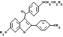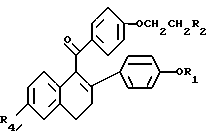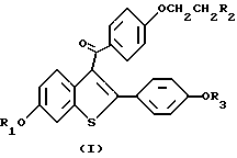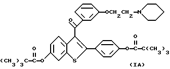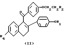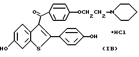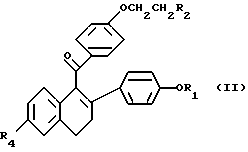 Приготовление лекарственных средствВ нижеприведенных препаратах термин “Активный ингредиент” означает соединение формулы I или II. Композиция 1. Желатиновые капсулы Твердые желатиновые капсулы приготавливаются с использованием следующих компонентов, мг/капсулу: Активный ингредиент – 0,1 – 1000 Крахмал, NF – 0 – 650 Сыпучий крахмальный порошок – 0 – 650 Силиконовая жидкость, 350 сантистоксов – 0 – 15 Ингредиенты смешивают, пропускают через сито N 45 меш (США) и вводят в твердые желатиновые капсулы до их заполнения. Состав специфических капсул, приготовленных на основе соединения формулы I в случае, когда это соединение представлено ралоксифеном, включает следующие указанные в нижеприведенных примерах ингредиенты: Композиция 2. Капсулы ралоксифена, мг/капсулу: Ралоксифен – 1 Крахмал, NF – 112 Сыпучий порошок крахмала – 225,3 Силиконовая жидкость, 350 сантистоксов – 1,7 Композиция 3, мг/капсулу: Ралоксифен – 5 Крахмал, NF – 108 Сыпучий порошок крахмала – 225,3 Силиконовая жидкость, 350 сантистоксов – 1,7 Композиция 4. Капсулы ралоксифена, мг/капсулу: Ралоксифен – 10 Крахмал, NF – 103 Сыпучий порошок крахмала – 225,3 Силиконовая жидкость, 350 сантистоксов – 1,7 Композиция 5. Капсулы ралоксифена, мг/капсулу: Ралоксифен – 50 Крахмал, NF – 150 Сыпучий порошок крахмала – 397 Силиконовая жидкость, 350 сантистоксов – 3,0 Приведенные выше специфические препараты могут быть изменены в соответствии с потребностью в обоснованных изменениях состава препарата. Лекарственный препарат в форме таблеток приготавливается с использованием следующих компонентов, приведенных ниже: Композиция 6. Таблетки, мг/капсулу: Активный ингредиент – 0,1 – 1000 Целлюлоза микрокристаллическая – 0 – 650 Двуокись кремния дымящаяся – 0 – 650 Стеариновая кислота – 0 – 15 Компоненты смешивают, прессуют для получения таблеток. Альтернативно, таблетки, каждая содержащая 0,1 – 1000 мг активного ингредиента, получают следующим образом. Композиция 7. Таблетки, мг/капсулу: Активный ингредиент – 0,1 – 1000 Крахмал – 45 Целлюлоза микрокристаллическая – 35 Поливинилпирролидон (в виде 10%-ного раствора в воде) – 4 Натрий-карбоксиметилцеллюлоза – 4,5 Стеарат магния – 0,5 Тальк – 1 Активный ингредиент, крахмал и целлюлоза пропускаются через фильтр N 45 меш (США) и тщательно перемешиваются. К полученному порошку добавляется раствор поливинилпирролидона, смесь после этого пропускается через сито N 14 меш (США). Полученные таким способом гранулы высушиваются при температуре 50 – 60oC и пропускаются через сито N 18 меш (США). Натрий-карбоксиметилцеллюлоза, крахмал, стеарат магния и тальк, предварительно пропущенные через сито N 60 (США), добавляются к гранулам, которые после перемешивания подвергаются прессованию на машине для получения таблеток. Суспензии, содержащие 0,1 – 1000 мг медикамента на 5 мл дозы, приготавливаются следующим образом. Композиция 8. Суспензии, мг/5 мл: Активный ингредиент – 0,1 – 1000 мг Натрий-карбоксиметилцеллюлоза – 50 мг Сироп – 1,25 мг Раствор бензойной кислоты – 0,10 мл Ароматизатор – q.v Краситель – q.v Очищенная вода до – 5 мл Медикамент пропускается через сито N 45 меш (США) и смешивают с натрий-карбоксиметилцеллюлозой и сиропом с образованием однородной пасты. Раствор бензойной кислоты, ароматизатор и краситель разбавляют некоторым количеством воды и добавляют к пасте при перемешивании. Далее добавляют воду до получен