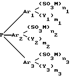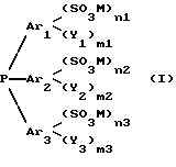 ![]() где Ar1, Ar2 и Ar3, одинаковые или различные, означают арильные группы; Y1, Y2 и Y3, одинаковые или различные, означают: алкильный радикал, содержащий 1-4 атома углерода, алкоксирадикал, содержащий 1-4 атома углерода, атом галогена, радикал CN, радикал NO2, радикал ОН, радикал NR1R2, и R1, R2, одинаковые или различные, означают алкильный радикал, содержащий 1-4 атома углерода; М – означает минеральный или органический катионный остаток, с которым соединение формулы I растворимо в воде, выбранный из группы, включающей H+, катионы, производные щелочных или щелочно-земельных металлов, N(R3R4R5R6)+, где R3, R4, R5 и R6, одинаковые или различные, означают алкильный радикал, содержащий 1-4 атома углерода, или атом водорода, другие катионы, производные металлов, соли которых с бензолсульфоновой кислотой растворимы в воде; m1, m2 и m3 означают целые числа, одинаковые или различные, от 0 до 5; n1, n2 и n3 означают целые числа, одинаковые или различные, от 0 до 3, причем одно из них по меньшей мере равно или выше 1. 2. Способ по п.1, отличающийся тем, что электролизная ячейка электролизера включает катодное отделение и анодное отделение, разделенные сепаратором, представляющим ионообменную мембрану или пористую диафрагму. 3. Способ по одному из п.1 или 2, отличающийся тем, что катод электролизной ячейки выполнен из такого материала, как платина, золото, иридий, рутений, палладий, никель, графит, стеклографит, железо, нержавеющая сталь, специальная сталь, свинец, ртуть, амальгама или может состоять из титана, тантала, никеля или нержавеющей стали, покрытого слоем платины, золота, иридия, рутения, смеси нескольких из этих металлов, оксидов платины, палладия, иридия, родия, рутения, осмия, тантала или смеси нескольких из этих оксидов. 4. Способ по одному из пп.1 – 3, отличающийся тем, что катод и анод электролизной ячейки имеют плоскую структуру, такую, как пластина, сетка, или объемную структуру и могут быть перфорированными или развернутыми. 5. Способ по одному из пп.1 – 4, отличающийся тем, что катод или анод имеют объемную структуру, выбранную из совокупности гранул материалов, которые их образуют, войлочной или губчатой формы указанных материалов. 6. Способ по одному из пп.1 – 5, отличающийся тем, что анод является таким материалом, как платина, золото, иридий, рутений, палладий, никель, графит, стеклографит, нержавеющая сталь, специальная сталь, свинец, или может состоять из титана или тантала, покрытого слоем платины, золота, иридия, рутения, смеси нескольких из этих металлов, оксидов платины, палладия, иридия, родия, рутения, осмия, тантала или смеси нескольких из этих оксидов. 7. Способ по одному из пп.1 – 6, отличающийся тем, что сепаратор выбирают из мембран катионного типа, приготовленных из катионообменных смол, имеющих кислые группы, такие, как сульфоновые группы или карбоксильные группы и предпочтительно из мембран, полученных из сульфоновых смол. 8. Способ по одному из пп.1 – 6, отличающийся тем, что сепаратор выбирают из диафрагм, выполненных из пористой керамики, диафрагм из тканых или из нетканых синтетических волокон, из нанесенных диафрагм на основе асбестового волокна или синтетических волокон. 9. Способ по одному из пп.1 – 8, отличающийся тем, что используют сульфированный фосфин общей формулы I, в которой Ar1, Ar2 и Ar3 означают фенильные группы, Y1, Y2 и Y3 означают группы, выбранные из алкильных ради