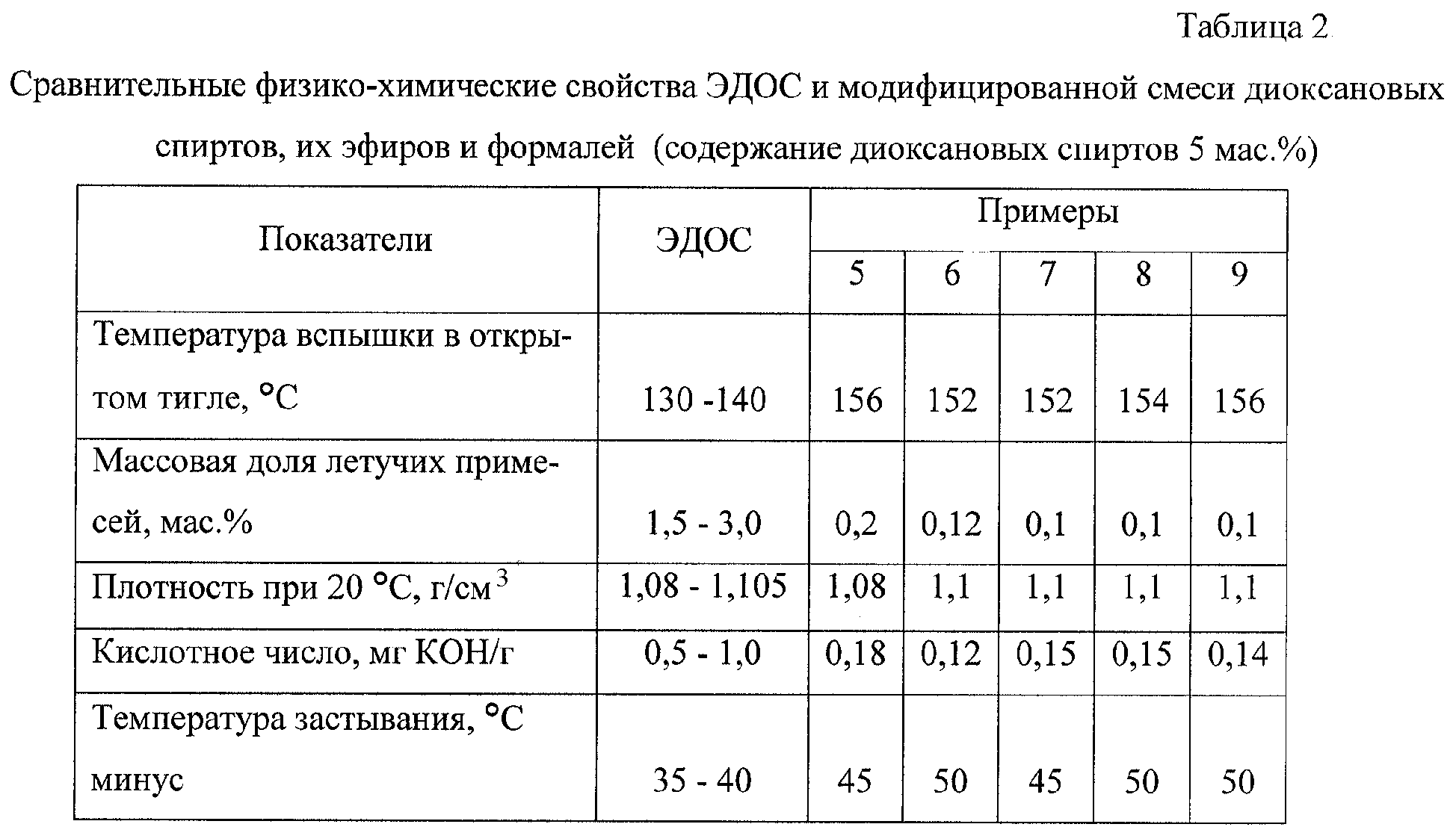 Изобретение относится к способам химической модификации диоксановых спиртов, а также смесей этих спиртов с их эфирами и формалями, которые являются отходами производства изопрена и, в частности, используются в качестве вторичного пластификатора в производстве поливинилхлоридных композиций. Технический результат – обеспечение возможности использования отходов производства изопрена в качестве первичного пластификатора для переработки эмульсионного и суспензионного поливинилхлорида (далее ПВХ), а также улучшение санитарно-токсикологических условий его переработки. Смесь производных 1,3-диоксана, представляющая собой высококипящий побочный продукт (далее ВПП), образуется при получении 4,4-диметил-1,3-диоксана конденсацией изобутилена с формальдегидом в производстве изопрена (см. Огородникова С.К., Идлис Г.С. Производство изопрена. – Л.: Химия, 1973 с.47, 55-58; Готлиб Е.М. Отходы и побочные продукты народно-хозяйственных производств – сырье для органического синтеза. М.: Химия, 1989, с.182-183). После вакуумной ректификации ВПП из него выделяют диоксановые спирты и фракцию с температурой кипения 115-160°С при 5-10 мм рт. ст., содержащую смесь диоксановых спиртов, их эфиров и формалей, которая после дополнительного формилирования используется в качестве пластификатора (ТУ 2493-003-13004749-93, торговая марка ЭДОС) в составе поливинилхлоридных композиций в производстве линолеума, обувных пластикатов, клеенки, искусственных кож и других материалов (см. патент RU 2051934, МПК 6 С 08 L 27/06, С 08 К 13/02, D 06 Н 3/06,1996 – искусственная кожа; патент RU 2045553, МПК 6 С 08 L 23/06, 53/00, 91/00, С 08 К 13/02, 1997 – листовые материалы; патент RU 2095381, МПК 6 С 08 L 27/06, С 08 К 13/02,1997 – пеноплен; патент RU 2051933, МПК 6 С 08 L 27/06, С 08 К 13/02, D 06 N 1/00, 1996 – линолеум). Пластификатор ЭДОС представляет собой прозрачную маслянистую жидкость от желтого до коричневого цвета с характерным запахом. Физико-химические свойства ЭДОС приведены в таблице 2. Существенным недостатком ЭДОС является то, что из-за присутствия свободных диоксановых спиртов он обладает повышенной летучестью, невысокой пластифицирующей способностью, низкими термическими характеристиками (температура вспышки, термостабильность, устойчивость к термоокислительной деструкции). По этим важнейшим характеристикам ЭДОС в значительной мере уступает наиболее широко распространенным фталатным пластификаторам (так, для диоктилфталата температура кипения составляет 229°С при 4,5 мм рт.ст., а температура вспышки 205°С). В связи с этим ЭДОС не может использоваться в поливинилхлоридных композициях как самостоятельный пластификатор, поскольку он не обеспечивает достаточного уровня эксплуатационных свойств полученных материалов по показателям термостабильность, жесткость, морозостойкость. В связи с вышеуказанным ЭДОС может использоваться лишь в качестве вторичного пластификатора (в количестве 5-30 мас.% от первичного пластификатора) в сочетании с диоктилфталатом или другими сложноэфирными пластификаторами. Низкая температура начала кипения и низкая термостабильность ЭДОС приводит к частичному испарению и разложению его при переработке с образованием формальдегида, ацетальдегида и изомасляной кислоты, что существенно ухудшает санитарно-гигиенические условия производства пластифицированных изделий. Низкая температура вспышки (130-140°С) препятствует его приме