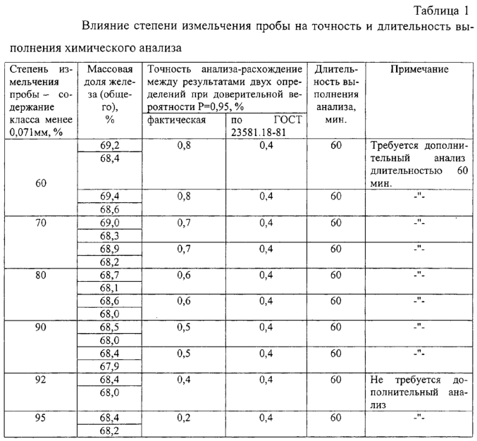II Расчет содержания металлических включений (табл.2.) 1 Содержание металлических включений размером более 50 мм Остаток шлака 100,0-2,5=97,5% 2 Содержание металлических включений размером более 40 мм Остаток шлака 100,0-0,8=99,2% 3 Содержание металлических включений размером более 20 мм Остаток шлака 100,0-8,4=91,6% 4 Содержание металлических включений размером более 10 мм Остаток шлака 100,0-18,1=81,9% 5 Содержание металлических включений размером более 3,0 мм Остаток шлака 100,0-19,6=80,4% 6 Содержание металлических включений размером более 0,5 мм Остаток шлака 100,0-9,8=90,2% 7 Содержание металлических включений размером более 0,16 мм Остаток шлака 100,0-6,0=94,0%, 8 Содержание шлакового остатка в объединенной пробе 0,90×0,902×0,804×0,819×0,916×0,992×0,975×100=45,9% 9 Содержание металлических включений в объединенной пробе 100,0-49,5=50,5% Определение железа (общего) в железосодержащих материалах, в том числе и в шлаках, производится по ГОСТ 23581.18-81. – Руды железные, концентраты, агломераты и окатыши. Метод определения железа (общего). Статистические данные показывают, что массовая доля железа (общего) в конвертерном шлаке фракции 10-50 мм изменяется от 50 до 70%, то согласно п.4.2 этого ГОСТа при массовой доле железа от 50 до 70% расхождение между результатами двух определений при доверительной вероятности Р=0,95 (точность анализа) не должно превышать 0,4%. Химический анализ пробы осуществляется в параллелях – в двух навесках массой по 0,5 г каждая. В среднем на выполнение анализа одной параллели затрачивается 60 минут. При расхождении между результатами двух определений более 0,4% из этой же пробы берутся новые две навески массой по 0,5 г, и анализ повторяется. В результате чего длительность анализа увеличивается на 60 минут, т.е. в два раза. При повторном расхождении между результатами двух определений более 0,4% проба отправляется на доизмельчение. Точность анализа зависит от степени измельчения пробы – содержания класса менее 0,071 мм. Влияние степени измельчения пробы на точность и длительность анализа приведено в таблице 1. Как показывают данные таблицы 1, при степени измельчения пробы 92% и более процентов достигается необходимая точность анализа и длительность его сокращается на 60 минут.