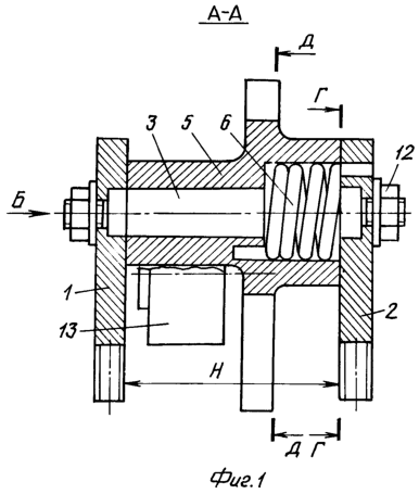 Приспособление поясняется чертежами, где на фиг.1 изображено сечение А-А приспособления на фиг.2; на фиг.2 – вид Б на фиг.1; на фиг.3 – индивидуальная неподвижная ось поворотного рычага; на фиг.4 – вид В на фиг.3; на фиг.5 – спиральная пружина; на фиг.6 – сечение Г-Г на фиг.1; на фиг.7 – сечение Д-Д на фиг.1.