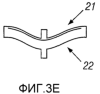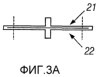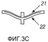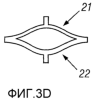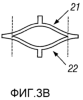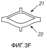 Вместо использования жестких опор, как показано на фиг.1А и 1В, можно сконструировать ячейку, где обеспечивается ограничение посредством изогнутых сжатых элементов, соединенных на каждом конце, как показано на фиг.3A-3F. Если оба сжатых элемента 21 и 22 имеют одинаковую толщину, как показано на фиг.3А и 3B, кривая прогиба под действием силы является линейной, и ячейка удлиняется при ее сжатии из разомкнутого положения (фиг.3В) в ее сомкнутое положение (фиг.3А). Если сжатые элементы ячейка имеют различные толщины, как показано на фиг.3C-3F, ячейка имеет характеристики прогиба под действием силы, показанные на фиг.2В, и не изменяет длину при перемещении между ее двумя устойчивыми положениями. Таким образом, расширяемую бистабильную трубу можно сконструировать так, чтобы при увеличении радиального размера осевая длина оставалась постоянной. В одном варианте, если отношение толщин составляет более приблизительно 2:1, более тяжелый сжатый элемент противостоит продольным изменениям. Изменяя соотношение размеров толстого и тонкого сжатых элементов, можно изменять силы их разведения и сведения. Например, фиг.3С и 3D иллюстрируют соотношение толщин приблизительно 3:1, а фиг.3Е и 3F иллюстрируют соотношение толщин приблизительно 6:1.