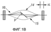 Используемые в настоящем изобретении бистабильные приспособления могут иметь преимущество принципа, иллюстрируемого на фиг.1А и 1В. На фиг.1А показан стержень 10, каждый конец которого прикреплен к жестким опорам 12. Если стержень 10 подвергается воздействию осевого усилия, он начинает деформироваться, как показано на фиг. 1В. При увеличении осевого усилия стержень 10 в конечном счете достигает своего предела продольного изгиба Эйлера и отклоняется к одному из двух устойчивых положений, показанных позициями 14 и 15. Если имеющий продольный изгиб стержень теперь закрепить в изогнутом положении, сила под прямым углом к длинной оси может вызывать перемещение стержня в одно из устойчивых положений, но не в другое положение. Когда стержень подвергается воздействию боковой силы, он должен переместиться на угол , прежде чем отклониться к его новому устойчивому положению.