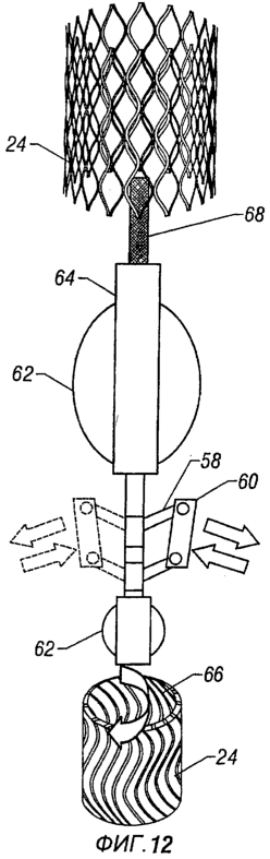 Исполнительные механизмы типа радиальных роликов можно использовать для расширения секций бистабильных труб. Фиг.12 иллюстрирует приводимый двигателем инструмент расширяемого радиального ролика. Инструмент содержит один или несколько комплектов рычагов 58, которые расширяются до установленного диаметра посредством механизма и шарнира. На конце каждого комплекта рычагов находится ролик 60. Можно прикреплять к инструменту приспособления 62 для центровки с целью правильного его расположения внутри буровой скважины и бистабильной трубы 24. Двигатель 64 создает усилие для поворачивания всего узла, таким образом поворачивая ролик (ролики) по периферии внутри буровой скважины. Ось ролика (роликов) расположена так, чтобы позволять ролику (роликам) свободно поворачиваться при контакте с внутренней поверхностью трубы. Каждый ролик может иметь сечение конической формы для увеличения площади соприкосновения поверхности ролика с внутренней стенкой трубы. Вначале ролики втягивают и инструмент продвигают внутри сжатой бистабильной трубы. Затем инструмент вращают посредством двигателя 64, и ролики 60 перемещаются во внешнюю сторону, чтобы войти в соприкосновение с внутренней поверхностью бистабильной трубы. После вхождения в соприкосновение с трубой ролики поворачиваются во внешние стороны на большее расстояние для приложения направленного во внешние стороны радиального усилия к бистабильной трубе. Направленное наружу перемещение роликов можно выполнять посредством центробежной силы или соответствующего исполнительного механизма, подсоединенного между двигателем 64 и роликами 60.