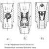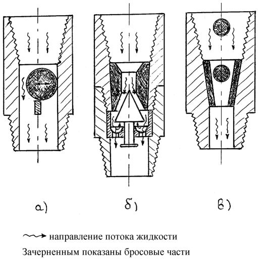 Конусный гидропульсатор (б) состоит из переводника, включаемого в состав КНБК и имеющего внутри опору с подвижным конусом, направленным навстречу потоку. Втулка (составная часть гидропульсатора) находится наверху и при необходимости сбрасывается в колонну труб и доставляется вниз потоком жидкости. При сочленении с забойной частью за счет прокачки жидкости гидропульсатор возбуждает в колонне труб высокочастотные (до 3 Кгц) продольные колебания, которые способствуют ликвидации прихвата, например, при затяжке сальника над долотом.