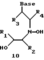Пример 4На фиг. 4 исходный аминоспирт 21 окисляют смесью CrO3/пиридин с получением альдегида 28. Этот альдегид при взаимодействии с алкилгалогенидом в присутствии основания должен дать соединение 29. Аминоспирт 29 затем может быть трансформирован в строительный блок 35 способом, аналогичным стадиям, использованным на фиг. 1 и 2. Пример 5 На фиг. 5 первые четыре стадии по существу аналогичны первым четырем стадиям, использованным на фиг. 1, только вместо серина используют аспарагиновую кислоту. Метиловый эфир аспарагиновой кислоты 36 дает полностью защищенный спирт 40, который после селективного снятия защиты уксусной кислотой дает 41. Окисление 41 смесью CrO3/пиридин дает соответствующий альдегид 42. Восстановительное аминирование альдегида 42 о-бензилгидроксиламином в присутствии триацетоксиборогидрида натрия должно дать 43 (T. Kolasa and М.J. Miller, J. Org. Chem., 1990, 55, 1711). Спирт 39 затем превращают в альдегид 46, используя по существу те же реакционные условия, как указанные выше, но с аллильной защитной группой для гидроксильной функции 39. Сочетание альдегида 46 и гидроксиламина 43 в присутствии триацетоксиборогидрида натрия с последующим снятием защиты аминозащищающих групп должно привести к бисамину 48. Бисамин 48 может быть затем превращен в димер 53 с последующими стадиями, использованными на фиг. 1. Пример 6 На фиг. 6 сочетание спирта 54 с О-бензилгидроксиламином 55 в условиях реакции Митсунобу (Mitsunobu, Sinthesis, 1981, 1) дает соединение 56. Промежуточное соединение 56 при гидрогенизации с последующим ацетилированием должно привести к 57. Под действием TFA в соединении 57 деблокируются “TBDMSI” защитные группы и получается 58. Сочетание 58 с 7 с последующим диметокситритилированием должно дать 60. Финальный строительный блок 62 получают из 60 основным гидролизом с последующим фосфитилированием. Пример 7 На фиг. 7 серинол 4 превращают в галогенид 59 и алкилируют с тимином с получением 63. Защитные группы в 63 удаляют, сочетают с DMT-защищенной гидроксиуксусной кислотой и фосфитилируют с получением 66. Пример 8 На фиг. 8 спирт 64 сочетают с N-гидроксиламинопропановой кислотой 69 с получением 70. Алкилирование тимина галогенидом 73 дает 74, которое после снятия защиты, сочетания с 76 с последующим гидролизом должно привести к 78. Конденсация 78 с 70 с последующим фосфитилированием должна дать гидроксаматный димер 80. Пример 9 На фиг. 9 N-гидроксиламинопропановый альдегид 81 используют для сочетания со спиртом 64. Димер 88 получают из 83 и 86 с последующими стадиями, использованными на фиг. 8. Пример 10 На фиг. 10 алкилирование (T.Kolasa and М.J. Miller, J. Org Chem., 1990, 55, 4246) метилового эфира -бром- -аминопропановой кислоты 89 тимином дает 90. Промежуточное соединение 90 при гидролизе гидроксидом натрия дает кислоту 91, которую сочетают с 6 с получением 92. Соединение 92 затем превращают в фосфорамидитный строительный блок 95, используя стадии, описанные на фиг. 1.