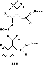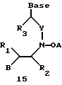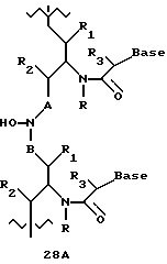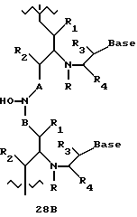 Пример 11На фиг. 11 тимин алкилируют алкиламиногалогенидом 96 (получение аминоалкилгалогенида смотри R. K. Olsen, К. Ramasamy and Т. Emery, J.Org. Chem., 1984, 49, 3527 and Islam et al., J.Med. Chem., 1994, 37, 293-304) с получением 97. Соединение 97 под действием TFA с последующим алкилированием даст 100. Строительный блок 103 получают из 100 путем диметокситритилирования, гидролиза и последующего фосфитилирования. Пример 12 На фиг. 12 показан альтернативный путь получения димера 111 с гидроксаматным скелетом из N-гидроксиламина 43 и альдегида 107, который в свою очередь получают из аспарагиновой кислоты. Пример 13 На фиг. 13 димер 115 получают из промежуточного соединения 108 и 13 с последующими стадиями, описанными на фиг. 2. Пример 14 На фиг. 14 получают N-гидроксилтимин (смотри Kim, C.U., et al. Tetrahedron Letts. , 1992, 33, 25-28) и сочетают с N-гидроксифталимидом с получением 117, который под действием гидразина в этаноле должен дать 118. Обработка 118 DMT-защищенным эпоксидом глицерина 119 дает 120. Промежуточное соединение 120 затем превращают в фосфорамидит 121, используя стандартные методики. Во втором синтезе соединение 118 сочетают с аминокислотным альдегидом 122 в условиях восстановительного аминирования с получением 123. Защита вторичной аминофункциональности с помощью FMOCCI с последующим гидролизом дает 125. Пример 15 На фиг. 15 1,2-гидроксипропановую кислоту 126 сочетают с N-гидроксиламин тимином 118 с получением 127, который затем трансформируют в фосфорамидитный синтон 129 в стандартных условиях. Соединение 118 также сочетают с адипиновой кислотой и трансформируют в нуклеинокислотный строительный блок 133. Пример 16 На фиг. 16 первый строительный блок 136 синтезируют из 118 и 134 схожим с описанным на фиг. 1 образом. Сочетание 139 со 118 даст 140. Обработка 137 с помощью 118 должна дать 138, который при конденсации со 140 дает димер 141. Пример 17 На Фиг. 17 альдегид 142 и бензиловый эфир глицина сочетают с получением 143. Обработка 143 с помощью 7 дает 145, который под действием уксусной кислоты дает 148. Митсундовское алкилирование 148 с помощью Boc-NH-O-ацетилгидроксиламина дает 147, который при гидрогенизации дает строительный блок 150. Схожим образом, сочетание 143 с 13 с такими же, как указано выше, последующими реакциями дает синтон 149. Пример 18 На фиг. 18 восстановительное аминирование альдегида 142 и Boc-NH-O-бензилгидроиламина дает 151. Гидрогенизация 151 с последующим алкилированием 152 гликолевой кислотой 153 (B.C. Borer and D.C. Balogh, Tetrahederon Letts, 1991, 32, 1039) даст 154. Обработка 154 с помощью TFA удалит Boc защитную группу, что при сочетании даст 155. Гидроксилзащитные группы на 155 могут быть селективно удалены уксусной кислотой с получением 156. Затем соединение будет трансформировано в строительный блок 157 с использованием стандартных реакционных условий. Схожим образом строительный блок 158 будет получен путем сочетания 154 с 13 с последующими стадиями, используемыми для получения 157. Пример 19 На фиг. 19 алкилирование тимин-N-гидроксиламина 160 спиртом 162 приведет к 163. Соединение 163 может быть трансформировано в фосфорамидитный строительный блок 166 с помощью последующих стадий, использованных на фиг. 1. Пример 20 На фиг. 20 первое промежуточное соединение 169 синтезируют из глутаминовой кислоты с использованием стандартных реакционных условий. Алкилирование тимина с помощью 169 даст 170, которое при обработке с помощью TFA даст 171. Промежуточное соединение 171 можно сочетать с Boc-глицином с получением 173, который п