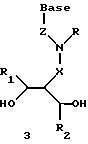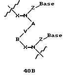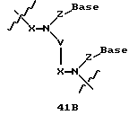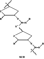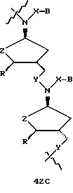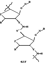![]() где N обозначают азот, Группа I Х обозначает CHR2OH, где R2 обозначает Н, (низший алкил)амин или (низший алкил)имидазол; Y обозначает Base-(CH2)n-, где Base обозначает негалогенизированное вариабельное нуклеозидное основание, где n = 1 – 7; А обозначает карбонил; Z обозначает Н или OR3, где R3 обозначает Н, низший алкил, (низший алкил)амин или (низший алкил)имидазол; W обозначает CHR4OH, где R4 обозначает Н, (низший алкил)амин или (низший алкил)имидазол; Группа II А обозначает карбонил; Х обозначает Base-(CH2)n-, где Base обозначает негалогенизированное вариабельное нуклеозидное основание, где n = 1 – 3; Y обозначает -СН2ОН; W обозначает -СН2ОН; Z обозначает Н. 2. Олигонуклеотид, в состав которого включены соединения по п.1 таким образом, что межнуклеотидные связи находятся между W и Х в группе I, W и Y в группе II. 3. Олигонуклеотид по п.2, где межнуклеотидная связь содержит фосфодиэфир. 4. Олигонуклеотид по п.2, где межнуклеотидная связь содержит фосфоротиоат. 5. Олигонуклеотид по п.2, где межнуклеотидная связь содержит фосфорамидат. 6. Олигонуклеотид по п.2, где межнуклеотидная связь содержит гидроксамат. 7. Олигонуклеотид по п.2, в котором различимо множество мономеров, где по меньшей мере один из мономеров содержит 2′-дезоксирибозный нуклеозид, и дополнительно содержит по меньшей мере две различных межнуклеотидных связи из группы, состоящей из фосфодиэфира, фосфортиоата, фосфорамидата и гидроксамата. 8. Олигонуклеотид по п.7, который имеет 2′-дезоксирибознонуклеозидное пентафуранозильное кольцо, в котором кольцевой кислород замене одной из групп S, CH2 или NR6, где R6является ацетилом, низшим алкилом, карбонилом, карбонил(низший алкил)амином или карбонил(низший алкил)имидазолом. РИСУНКИ
