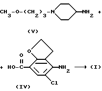 ![]() или его фармацевтически приемлемая кислота-аддитивная соль. 2. Соединение по п.1, которое представляет моногидрохлорид 4-амино-5-хлор-2,3-дигидро-N-[1-(3-метоксипропил)-4-пиперидинил] -7-бензофуранкарбоксамида. 3. Соединение по п.1, которое представляет бутандиоат 4-амино-5-хлор-2,3-дигидро-N-[1-(3-метоксипропил)-4-пиперидинил] -7-бензофуранкарбоксамида (1:1). 4. Фармацевтическая композиция, обладающая энтерокинетическими свойствами, включающая фармацевтически приемлемый носитель и терапевтически эффективное количество соединения по любому из пп.1-3. 5. Способ получения фармацевтической композиции по п.4, согласно которому терапевтически эффективное количество соединения по любому из пп.1-3 тщательно смешивают с фармацевтически приемлемым носителем. 6. Соединение по любому из пп.1-3, обладающее энтерокинетическими свойствами. 7. Соединение по любому из пп.1-3, обладающее способностью ускорять прохождение содержимого через кишечник. 8. Способ получения соединения по п.1 или 2, по которому промежуточный продукт формулы II ![]() N-алкилируют алкилирующим реагентом формулы III CH3-O-(CH2)3-W, где W представляет подходящую уходящую группу, такую, как галоид, например хлор, или сульфонилокси уходящую группу, в реакционно инертном растворителе в присутствии подходящего основания, и, при желании, соединение формулы I превращают в терапевтически активную нетоксичную кислотно-аддитивную соль или, наоборот, кислотно-аддитивную соль превращают в форму свободного основания с помощью щелочи. 9. Способ получения соединения по п.1 или 2, по которому амин формулы V N-ацилируют карбоновой кислотой формулы IV ![]() ![]() и, при желании, соединение формулы I превращают в терапевтически активную нетоксичную кислотно-аддитивную соль или, наоборот, кислотно-аддитивную соль превращают в форму свободного основания с помощью щелочи. РИСУНКИ