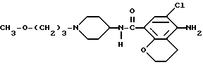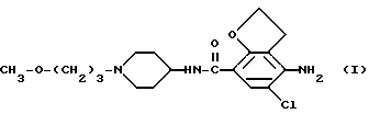 (57) Реферат: Описывается новое соединение 4-амино-5-хлор-2,3-дигидро-N-[1-(3-метоксипропил)-4-пиперидинил] -7-бензофуранкарбоксамид или его фармацевтически приемлемая кислотно-аддитивная соль, проявляющее энтерокинетические свойства. Описываются также фармацевтические композиции, содержащие эти новые соединения, способы получения соединений и композиций и использование их в качестве лекарственных средств, в частности при лечении состояний, включающих пониженную перистальтику кишечника. 5 c. и 8 з.п.ф-лы, 3 табл. Данное изобретение относится к новому производству бензамида и его фармацевтически приемлемым кислотно-аддитивным солям, фармацевтическим композициям, содержащим указанные соединения, способам получения данных соединений и композиций и использованию их в качестве лекарственных средств, в частности, при лечении состояний, включающих ослабленную перистальтику кишечника, в особенности ободочной кишки. В нашей Европейской заявке на патент (ЕР) 0 389037-A, опубликованной 26 сентября 1990, раскрываются производные N-(3-гидрокси-4- пиперидинил) (дигидробензофуран или дигидро-2H-бензопиран) карбоксамида как имеющие свойства, стимулирующие перистальтику желудочно-кишечного тракта. В нашей ЕР 0 445862-A, опубликованной 11 сентября 1991, раскрываются производные N-(4-пиперидинил) (дигидробензофуран или дигидро-2Н-бензопиран)карбоксамида, также имеющие свойства, стимулирующие перистальтику желудочно-кишечного тракта. Соединение, являющееся объектом данной заявки, отличается от них тем, что демонстрирует превосходящие энтерокинетические свойства. Данное изобретение относится к соединению формулы (I)и его фармацевтически приемлемым кислотно-аддитивным солям. Химическим названием соединения формулы (I) является 4-амино-5- хлор-2,3-дигидро-N-[1-(3-метоксипропил)-4-пиперидинил]-7- бензофуранкарбоксамид. Подразумевается, что фармацевтически приемлемые кислотно-аддитивные соли, упоминаемые здесь выше, включают формы терапевтически активных нетоксичных кислотно-аддитивных солей, которые соединения формулы (1) способны образовывать. Последние можно удобно получить обработкой формы основания такой подходящей кислотой. Подходящие кислоты включают, например, неорганические кислоты, такие как галоидоводородные кислоты, например, соляную или бромистоводородную кислоту, серную, азотную; фосфорную и подобные кислоты; или органические кислоты, такие как, например, уксусная, пропановая, гидроксиуксусная, молочная, пировиноградная, щавелевая, малоновая, янтарная (т.е. бутандиовая кислота), малеиновая, фумаровая, яблочная, винная, лимонная, метансульфокислота, этансульфокислота, бензолсульфокислота, п- толуолсульфокислота, цикламиновая, салициловая, п- аминосалициловая, памовая и подобные кислоты. Используемый здесь ранее термин ”аддитивная соль” включает также сольваты, которые способны образовать соединения формулы (1), а также их соли. Такие сольваты являются, например, гидратами, алкоголятами и тому подобными. Наоборот, форму соли можно превратить обработкой щелочью в форму свободного основания. В дальнейшем термин “соединения формулы (1)” означает соединение формулы (1), так же как и его фармацевтически приемлемые кислотно-аддитивные соли, если не оговорено иное. Интересными соединениями формулы (1) являются кислотно-аддитивные соли, которые образу