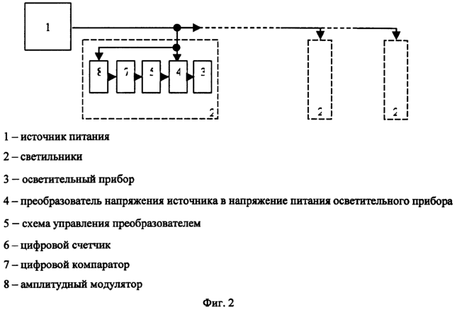 На фиг.2 представлена структурная схема предлагаемого устройства с источником питания переменного тока. На фиг.3 представлена структурная схема предлагаемого устройства с источником питания постоянного тока (аккумулятором). Устройство (фиг.2) содержит: 1 – источник питания (аккумулятор); 2 – светильники; 3 – осветительный прибор; 4 – преобразователь напряжения источника в напряжение питания осветительного прибора; 5 – схему управления преобразователем; 6 – цифровой счетчик; 7 – цифровой компаратор. При этом источник питания 1 соединен в каждом из светильников 2 с преобразователем 4 напряжения источника в напряжение питания осветительного прибора 3 и с входом цифрового счетчика 6, цифровой компаратор 7 соединен по входу с цифровым счетчиком 6, а по выходу с входом схемы 5 управления преобразователем 4, выход преобразователя 4 подключен к осветительному прибору 3. В качестве источника питания 1 можно использовать генератор напряжения переменного тока или источник напряжения постоянного тока. В последнем случае (фиг.3) последовательно с источником питания 1 дополнительно соединен амплитудный модулятор.