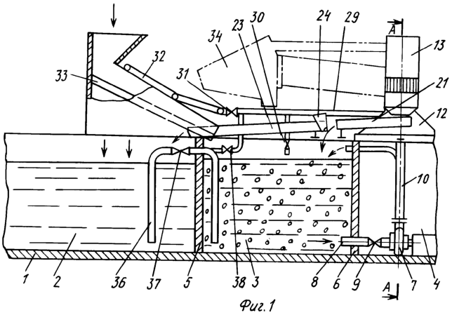 Расходный зумпф 3 и шламосборник 2 могут быть соединены между собой П-образной трубой 36 с задвижкой 37 с размещением срезов трубы 36 в нижних зонах расходного зумпфа 3 и шламосборника 2. При этом П-образная труба 36 через задвижку 38 связана с нагнетательным трубопроводом 29 (чистой воды).