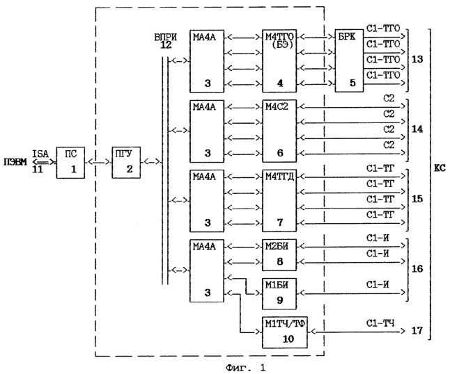 Мультиплексор телекоммуникационный многофункциональный (фиг.1) содержит плату сопряжения (ПС) 1, системный блок, в котором размещена плата группового управления (ПГУ) 2, модули адаптера четырехканальные асинхронные (МА4А) 3, модуль четырехканальный телеграфный однополярный (М4ТГ0) 4, модуль четырехканальный стыка С2 (М4С2) 6, модуль четырехканальный телеграфный двухполярный (М4ТГД) 7, модуль двухканальный биимпульсный (М2БИ) 8, модуль одноканальный биимпульсный (М1БИ). 9, модуль одноканальный телефонный (М1ТЧ/ТФ) 10 и блок регулировки и контроля (БРК) 5 в отдельном конструктиве, системную шину ISA ПЭВМ 11, внутренний параллельный интерфейс системного модуля 12, а также следующие шины подключения к каналам связи (КС): шину С1-ТГ0 подключения к телеграфным каналам связи 13, шину С2 14 подключения к физической линии, шину С1-ТГ подключения к телеграфному каналу 15, шину С1-И подключения к импульсному каналу 16, шину С1-ТЧ подключения к телефонному каналу связи 17.