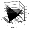 Сумма s=(x1w1+х2w2) должна быть нулевой при равенстве значений х1 и х2, что достижимо при w1=1, w2=-1, как показано на фиг.2. В этом случае, модуль суммы (сигнал на выходе блока 4 фиг.4) как функция от двух переменных х1 и х2 будет иметь вид, в отличие от прототипа, не одной поверхности, а двух подповерхностей под некоторым углом между собой, как показано на фиг.5. Если в этом случае модуль суммы преобразовать пороговой функцией (2) в блоке 5 фиг.4, т.е. ограничить плоскостью Рх1х2, которая на фиг.5 показана полупрозрачным тоном, то пересечение поверхности модуля с плоскостью Рх1x2 образует не одну, как у прототипа, а две разделяющие прямые.