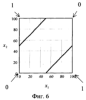 Из фиг.5-7 видно, что при x1=х2 (или х1 x2) нейрон на выходе будет давать нуль, а при х1 х2 – единицу. Таким образом, отделяя нулевые входные значения от единичных на плоскости Ox1x2 в отличие от прототипа не одной, а двумя прямыми, нейроном реализуется логическая функция неравнозначности.