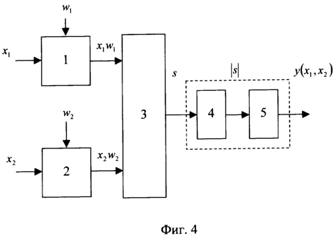 Предлагаемая модель нейрона, как и известная, содержит два перемножителя (блоки 1 и 2), осуществляющих перемножение входных сигналов с весовыми коэффициентами с учетом их знаков. В модели могут использоваться любые из известных, описанных в [10] перемножителей подобного типа. Как и в известной модели, перемноженные сигналы x1w1 и x2w2 поступают на вход сумматора (блок 3) со знаковыми входами/выходом [10]. В качестве знакового сумматора могут использоваться любые устройства подобного типа, например приведенные в [10]. Предлагаемая модель отличается от модели прототипа тем, что активационный блок состоит из двух последовательно соединенных блоков, как показано на фиг.4. При этом сумма s с выхода сумматора поступает сначала на вход блока 4 (фиг.4), в котором преобразуется модульной функцией активации вида , а затем с выхода блока 4 поступает на вход блока 5, где преобразуется пороговой функцией (1). В качестве блоков 4 и 5 могут быть использованы описанные в [10] технические устройства, реализующие соответствующие математические функции. Выход блока 5 предлагаемой модели является ее выходом. Таким образом, выход модели нейрона у(х1,х2) является результатом подстановки модуля суммы s в пороговую функцию (1). Полная функция передачи модели будет выглядеть