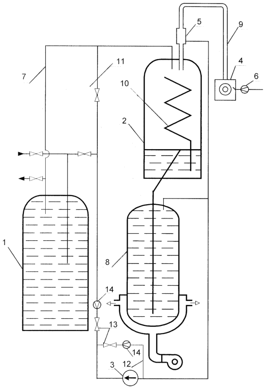 Осуществление способа регенерации ХЛ примесей натрия поясняется с помощью установки регенерации, представленной на чертеже. Установка содержит: холодную ловушку 1; регенерационную камеру 2; электромагнитный насос 3; вакуумный насос 4; конденсатор паров натрия 5; газовый расходомер 6; транспортные линии 7; отстойник оксидов 8, охлаждаемый воздухом; вакуумную линию 9; массообменные поверхности 10 в виде горизонтальных тарелок, по которым натрий последовательно переливается сверху вниз; байпасную линию холодной ловушки 11; байпасную линию электромагнитного насоса 12; регулирующие вентили 13; расходомеры натрия 14; электронагреватели, датчики и приборы контроля и электрооборудование.