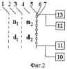 Предлагаемая управляемая неоднородность (фиг.2) выполнена из последовательно расположенных первой неуправляемой решетки – 1 с проводимостями , первого диэлектрического слоя – 2 с толщиной d1, второй неуправляемой решетки – 3 с проводимостями , второго диэлектрического слоя – 4 с толщиной d2, управляемого слоя – 5 в виде двумерно-периодической решетки – 6 проводящих элементов, в разрывы которых включены управляемые элементы – 7, к управляемым элементам подключены два источника первичного сигнала со своими поднесущими – 10, 11 и два регистрирующих устройства – 12, 13. Значения проводимостей , на частоте f1 отраженного сигнала и проводимостей , на частоте f2 проходного сигнала, а также толщина второго диэлектрического слоя d2 выбраны по специальным формулам, обеспечивающим одновременную модуляцию амплитуды и фазы как отраженного, так и проходного сигнала. В качестве управляемых элементов могут быть использованы параметрические диоды, варикапы, вариконды, сегнетокерамические конденсаторы, нелинейные индуктивности и т.д. В качестве источника первичного сигнала могут быть использованы микрофон, магнитофон. В качестве регистрирующего устройства могут быть использованы наушники, магнитофон. Источниками поднесущих сигналов могут являться миниатюрные генераторы малой мощности, выполненные, например, на лавинно-пролетных диодах [Тагер А.С., Вальд-Перлов В.М. Лавинно-пролетные диоды и их применение в технике СВЧ. – М.: Сов. радио, 1968, с.480].