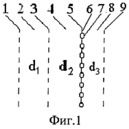 Управляемая неоднородность – прототип (фиг.1) выполнена из последовательно расположенных первой неуправляемой решетки – 1 с проводимостью В1, первого воздушного слоя – 2 с толщиной d1, второй неуправляемой решетки – 3 с проводимостью В2, второго воздушного слоя – 4 с толщиной d2, управляемого слоя – 5 в виде двумерно-периодической решетки – 6 проводящих элементов, в разрывы которых включены диоды – 7, третьего воздушного слоя – 8 с толщиной d3, третьей неуправляемой решетки – 9 с проводимостью B3.