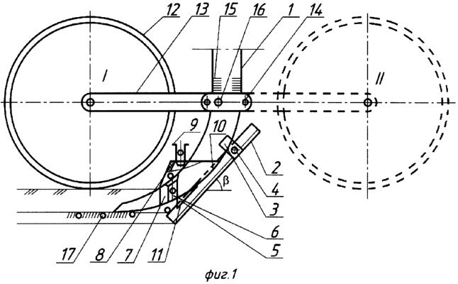 В процессе движения сеялки пластинчатый нож 2 делает вертикальный разрез в стерне, обеспечивая долотовидной лапе 1 проникновение в почву на требуемую глубину. Глубина поддерживается кольчато-шпоровым колесом 12. Задняя часть пластинчатого ножа 2 входит в пазы 10, 11 долотовидной лапы 1 и наральника 5, что обеспечивает стабильное движение в почве. Наральник 5 расположен на долотовидной лапе 1 выше глубины посева. За ним при движении образуется свободная от почвы зона, куда падают сквозь отверстие 6 в долотовидной лапе 1 семена 17, подаваемые раструбом 9. Концевой частью долотовидной лапы 1 семена 17 вдавливаются в щель, образованную пластинчатом ножом 2 в почве, на глубину посева. Величина вдавливания 10…15 мм, что обеспечивает хороший контакт семян 17 с почвой. Семена 17, выходя из раструба 9, перемещаются в направлении, противоположном направлению движения сеялки, что обеспечивает скорость падения семян 17 в посевную бороздку, близкую к нулевой. Наличие щели глубже расположения семян 17 облегчает проникновение в почву зародышевого корешка семени, ускоряя тем самым процесс набухания и прорастания. Глубина щели регулируется перемещением пластинчатого ножа 2 в вертикальной плоскости. Глубина хода сошника регулируется поднятием или опусканием кольчато-шпорового колеса 12 вокруг шарнира 14. На долотовидной лапе 1 имеется мерная линейка 15, указывающая с помощью кронштейна 13 глубину посева. После установки глубины посева кронштейн 13 фиксируется стопором 16. Кольчато-шпоровое колесо 12 расположено рядом с опорной частью долотовидной лапы 1, что обеспечивает точное копирование поверхности почвы и выдерживание заданной глубины посева. Кольчато-шпоровое колесо 12 рыхлит верхний слой почвы, заделывая посевную бороздку. При работе на комковатой почве кольчато-шпоровое колесо 12 устанавливают спереди (II).