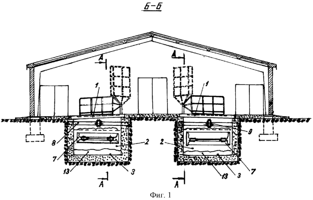 На фиг.1 показан поперечный разрез по поперечной оси симметрии длинного животноводческого или по внутреннему торцу короткого здания с показом навозных обетонированных траншей;