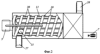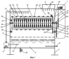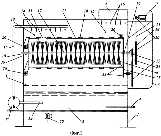 Машина для санитарной обработки яиц состоит из станины 1, емкости 2 для моющего раствора, фильтра 3, нагревателя 4, насоса 5, защитного кожуха 6, привода 7, щетки 8, воздушного электронагревателя 9 и транспортера, состоящего из неподвижного цилиндрического шнека 10 и расположенного внутри него концентрически направляющего цилиндра 11. Для подачи моющего раствора из емкости 2 к транспортеру устроен трубопровод 12. Поступление воды через отверстия трубопровода в зоне мойки 13 обозначено стрелками 14, поступление горячего воздуха в зоне сушки 15 – стрелками 16. Щетка 8 жестко закреплена на оси 17, которая вращается в подшипниках 18, направляющий цилиндр 11 вращается в подшипниках 19. Таким образом, щетка 8 и направляющий цилиндр 11 могут вращаться на одной оси с разной скоростью. Для вращения щетки 8 служит пара шкивов 20 с ременной передачей 21. Для вращения направляющего цилиндра 11 служат две пары 22 и 23 шестерен с цепными передачами 24 и 25. Неподвижный цилиндрический шнек 10 закреплен жестко на станине 1 с помощью соединений 26. Яйца для мойки поступают к неподвижному цилиндрическому шнеку 10 по подающему лотку-склизу 27, а выходят по приемному лотку-склизу 28. Для слива моющего раствора из емкости 2 служит кран 29. В направляющем цилиндре 11 выполнены продольные пазы 30, направленные параллельно образующей цилиндра. Ширина пазов 30 должна обеспечивать свободный проход яйца, а расстояние между витками спирали шнека 10 должно задерживать яйцо (кроме мест стыкования с лотками-склизами 27 и 28). Таким образом, яйцо 31 через продольные пазы 30 щеткой 8 прижато к спирали шнека 10.