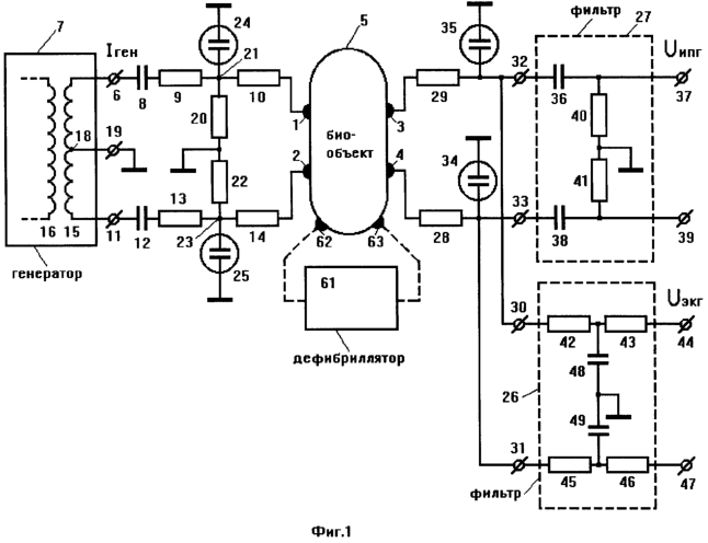 Одновременно со снятием параметров респираторного сигнала и кардиосигнала биообъекта 5 могут быть использованы при необходимости дефибриллятор или электрохирургический инструмент 61 (фиг.1). При включении, например, дефибриллятора 61 и подаче на биообъект высокого напряжения это напряжение через электроды 1, 2, 3, 4 и ограничительные резисторы 10, 14, 28, 29 поступает на разрядники 24, 25, 34, 35. Разрядники срабатывают, шунтируя выход генератора 7 и входы фильтров 26, 27 и ограничивая амплитуду высокого напряжения дефибриллятора 61 до уровня, безопасного для элементов устройства.