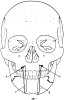 Через рану кожи лба на 1,5 см выше переносицы в переднюю поверхность лобной кости по средней линии был ввинчен шуруп. С помощью проводника Мелкого подвешивающую проволоку провели из точки на переходной складке на уровне 16-17 зубов подскуловым доступом в операционную рану на коже лба выше шурупа и далее в преддверие полости рта на уровне 26-27 зубов. На верхнюю челюсть был надет протез. В базисе протеза и альвеолярном отростке верхней челюсти были просверлены отверстия в области 16-17, 13-14, 13-24 и 26-27 зубов. Через отверстия в боковых отделах концы проволочных лигатур были проведены из преддверия полости рта на небную поверхность альвеолярного отростка. Далее они были выведены в небно-вестибулярном направлении в преддверие полости рта через отверстия в базисе протеза и в альвеолярном отростке во фронтальном отделе верхней челюсти. После этого проволока была проведена в рану на лбу вдоль боковой поверхности носа. После репозиции верхней челюсти лигатура была подтянута, а ее свободные концы фиксированы к шурупу. Рана на лбу ушита.