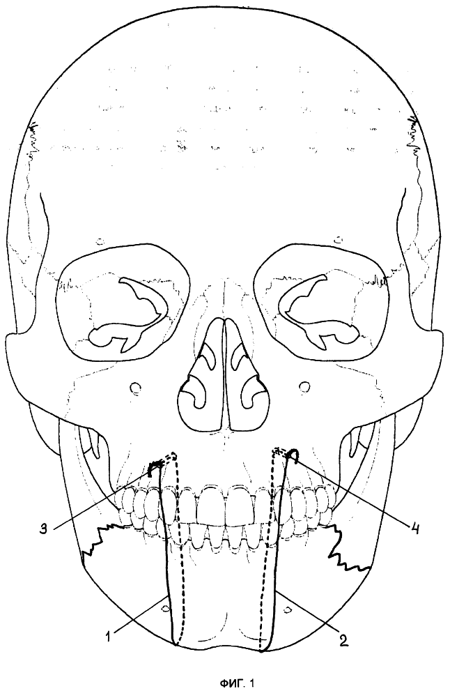 При переломах нижней челюсти (фиг.1) вмешательство выполняют под инфильтрационной анестезией на верхней и на нижней челюсти 2% раствором лидокаина. Обычно было достаточно 15-20 мл препарата. После выполнения анестезии через проколы кожи в подчелюстных областях с двух сторон вестибулярно и язычно проводят проволочные лигатуры 1 и 2 в области 44-43 и 33-34 зубов. При этом подбородочное отверстие остается на 0,5-1 см кзади от проволочного шва, что позволяет избежать повреждения одноименного нерва. Далее между первым премоляром и клыком верхней челюсти на уровне средней трети их корней справа и слева просверливают дваотверстия 3 и 4 в альвеолярном отростке, через которые проводят лигатуры 1 и 2. Такое расположение отверстий позволяет избежать перфорации гайморовой пазухи. На концы проволоки, выходящие из отверстий 3 и 4 в альвеолярном отростке верхней челюсти с вестибулярной стороны, надевают фрагменты подключичного катетера длиной 4-5 см, которые перемещают в костные каналы 3 и 4. Производят репозицию отломков нижней челюсти, после чего прикус фиксируют в положении центральной окклюзии путем скручивания концов проволочных лигатур. На область проколов кожи накладывают спиртовую марлевую салфетку, поверх которой накладывают подбородочно-теменную эластическую повязку. По окончании операции больным назначают местную гипотермию.