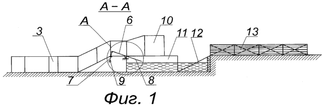 После погружения овцы с головой в дезинфицирующий раствор на 1-2 с она поднимает голову над раствором и плывет в ванне в сторону отстойного загона 13. Вследствие изгибов ванны увеличивается время пребывания овцы в ней до полного промачивания шерстного покрова животного (до 60 с). Кроме того, на поворотах происходит более интенсивное промачивание шерстного покрова за счет его раскрытия. После проплыва в ванне 11 овца по трапу 12 поднимается в отстойный загон 13, где она находится до полного отекания с нее дезинфицирующего раствора.