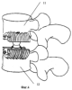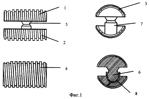 В торцевых концах обоих элементов с двух сторон выполнены углубления 9, необходимые для фиксации устройства в инструменте при установке. Для инструментальной фиксации в торцевых частях обоих элементов с одной стороны также предусмотрены пазы 10. Эндопротез устанавливают вместо удаляемого межпозвонкового диска между вышележащим 11 и нижележащим 12 позвонками.