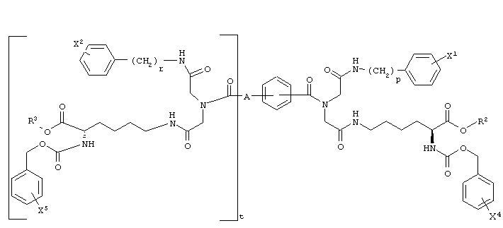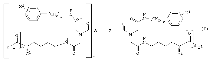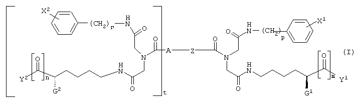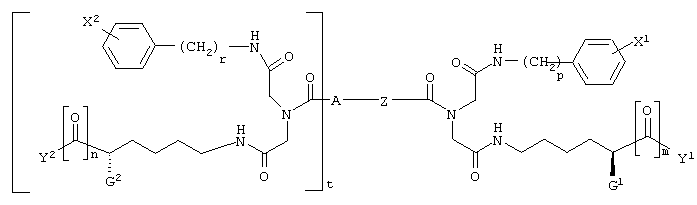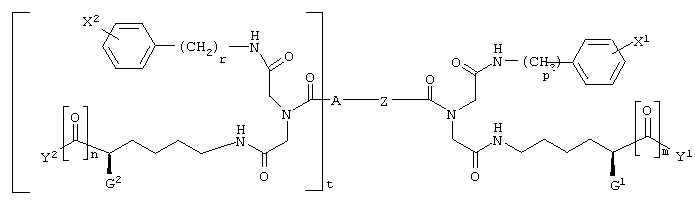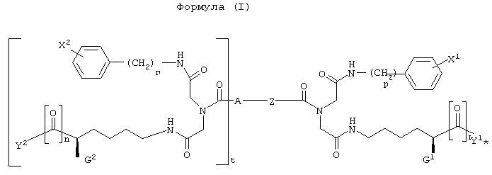 где G1 и G2, каждый независимо, представляет -NH-С(О)-О-R1, -NH-С(О)-О-(СН2)v-(С6Н4)-Х3, -NH-С(О)-NH-(СН2)v-(С6Н4)-Х3, -О-С(О)-NH-(СН2)v-(С6Н4)-Х3, -О-С(О)-О-(СН2)v-(С6Н4)-Х3 или -NH-С(О)-СН2-(С6Н4)-Х3, Y1 и Y2, каждый независимо, представляют -ОН, С1-С4 алкил, С1-С4 гидроксиалкил, С1-С4 алкокси, фенил, бензил или -NH2; R1 представляет С1-С4 алкил, Х1 и Х2, каждый независимо, представляют галоген или С1-С4 алкокси; Х3 представляет галоген, нитро, С1-С4 алкил, С1-С4 алкокси или С1-С4 перфторалкил; Z представляет -С С-, -С6Н4-, цис-СН=СН-, транс-СН=СН-, цис-СН2-СН=СН-СН2-, транс-СН2-СН=СН-СН2-, 1,4-нафтил, цис-1,3-циклогексил, транс-1,3-циклогексил, цис-1,4-циклогексил или транс-1,4-циклогексил; А представляет Н или ковалентную связь; m и n, каждый независимо, представляют целое число, имеющее значение 0 или 1; t представляет целое число, имеющее значение 0 или 1; и р, r и v, каждый независимо, представляют целое число, имеющее значение 1 или 2; при условиях, что когда А является Н, t равно 0; когда А является ковалентной связью, t равно 1; когда m равно 0, Y1 представляет С1-С4 гидроксиалкил; и когда n является 0, Y2 представляет С1-С4 гидроксиалкил.
