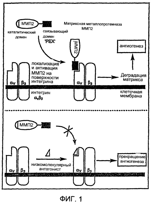 Инвазия сосудистых клеток в ткани требует координированного взаимодействия многочисленных факторов, включая протеиназы, которые ремоделируют архитектуру экстраклеточного матрикса, а также молекулы клеточной адгезии, которые распознают этот предварительный матрикс. В недавних сообщениях показано, что 72 кДа матриксная металлопротеиназа 2 (ММП2) играет ключевую роль в развитии сосудов и ангиогенеза. Например, Kitoh et al. (J. Cell Sci., 109, 953-8 (1996)) сообщают, что ММП2 и ее активатор мембранная матриксная металлопротеиназа типа 1 (МТ1-ММП) координированно экспрессируются мезенхимальными клетками почти исключительно во время эмбрионального развития, указывая на специфические ограничения реконструкции матрикса в этих тканях. Кроме того, ангиогенез и соответствующий рост опухолей снижается у дефектных по ММП2 мышей (см. Itoh et al., Cancer Res. 58, 1048-51 (1998)). Интересно, что Saftor et al. (Proc. Natl. Acad. Sci. U.S.A., 89, 1557-61 (1992)) показали, что лигирование интегрина v 3, известного как медиатор ангиогенеза, вызывает продукцию ММП2, что наводит на мысль о координированном взаимодействии этих двух молекул во время сосудистого ремоделирования, связанного с формированием кровеносного сосуда (см. также Bafetti et al., J. Biol. Chem., 273, 143-9 (1998)). Фактически прямое взаимодействие между ММП2 и интегрином v 3 было продемонстрировано Brooks et al. (Cell, 85, 683-93 (1996)). Негативная регуляция ММП2 во время сосудистой инвазии и созревания, как позднее показано Brooks et al., зависит от экспрессии v 3 (Cell, 92, 391-400 (1998)).