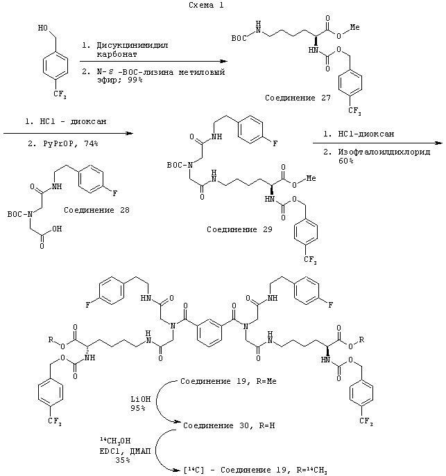 Синтез соединения 19 является иллюстрацией общего способа получения соединений формул (I) и (II), описанного Boger et al. Соединение 19 синтезировали в три стадии, начиная с доступного для приобретения метилового эфира N- -ВОС-L-лизина. Карбамат собирали с выходом 99% в реакции 4-(трифторметил)бензилового спирта с N,N-дисукцинимидилкарбонатом и с последующим добавлением активированного продукта со свободной -аминогруппой, получая промежуточное соединение 27. У этого лизинового производного затем удаляют защиту N-Вос (HCl) и соединяют с помощью бромтрипирролидинфосфония гексафторфосфата (PyBrOP, 74%) со свободной функциональной группой карбоновой кислоты моноамида иминодиуксусной кислоты, соединение 28, получая диамидное соединение 29. После удаления защиты N-ВОС (HCl) данное соединение димеризовали реакцией с изофталоилдихлоридом, завершая синтез и получая соединение 19 с выходом 60%. Радиоактивную метку включали в молекулу путем омыления двух метиловых эфиров (LiOH, 95%), получая дикарбоновую кислоту, соединение 30, с последующей эстерификацией [14С]-метанолом, опосредуемой 1-(3-диметиламино)пропил)-3-этилкарбодиимида гидрохлоридом (ЭДКИ) и катализом 4-диметиламинопиридином (ДМАП) с получением [14С]-соединения 1 при 35% выходе.