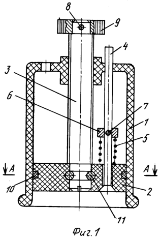 Медицинская банка состоит из корпуса 1, поршня 2, штока 3, клапана 4, пружины 5, кольца 6, штифтов 7, 8, кольца 9, кольца уплотнения поршня 10, штифтов 11. Корпус 1 изготовлен из прозрачного материала, нижний торец его утолщен и имеет радиусное закругление как с внутренней, так и с наружной стороны. В верхней части корпуса 1 выполнены три отверстия: одно из них снабжено резьбой для штока 3, второе – отверстие для клапана 4, третье – для соединения внутренней полости корпуса с атмосферой. Поршень 2 имеет центральное отверстие для гладкой части штока 3, отверстие с конусом для клапана 4 и кольцевую проточку для кольца уплотнения 10. Кроме этого, в поршне 2 выполнены два отверстия для штифтов 11. Шток 3 имеет гладкую ступень, которая входит в отверстие поршня 2; эта ступень снабжена кольцевой проточкой, имеющей радиус, равный радиусу штифта 8, резьбовую часть и гладкую ступень для кольца 9. Клапан 4 имеет отверстие для штифта 7, удерживающего кольцо 6, и коническую часть, входящую в конус отверстия поршня 2. Пружина 5 устанавливается на клапане 4 при сборке. После соединения штока 3 и поршня 2 в отверстия поршня вставляются два штифта 11 таким образом, что они проходят в кольцевую канавку штока 3. Такая конструкция позволяет штоку 3 свободно вращаться в поршне 2 и удерживать его. В отверстие поршня 2 вставляется клапан 4, на него надевается пружина и кольцо 6, которое фиксируется штифтом 7. После этого, вращая шток 3, вводят его в резьбовое отверстие корпуса 1, а клапан 4 – в гладкое отверстие. Затем кольцо 9 закрепляется штифтом 8 на штоке 3. Предварительно в канавку поршня 2 устанавливают кольцо уплотнения 10.