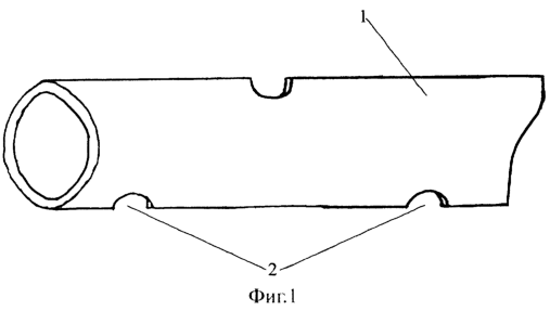 На фиг.1 изображена дренажная трубка по варианту 1, общий вид. Дренажная трубка выполнена из рассасывающегося материала полидиоксанона. В цельной стенке 1 трубки выполнены боковые отверстия 2 по всей длине, расположенные в два ряда диаметрально противоположно друг другу в шахматном порядке. Длина трубки может варьировать от 3 до 20 см, наружный диаметр – от 2,5 до 20 мм, внутренний – от 2 до 16 мм, диаметр отверстий – от 1,5 до 3,0 мм.
