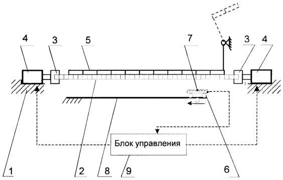 Натягиваемую сетчатую основу 2 закрепляют в зажимах 3 и растягивают с помощью серводвигателей 4. Эталонную сетку 5, расположенную над или под натягиваемой сетчатой основой, совмещают с последней. При этом возникает вторичный рисунок – муар. Сканирующую планку 6 перемещают по направляющим 8 вдоль сеток 2 и 5. При этом светочувствительные элементы 7 считывают картину муаровых полос и посылают полученные сигналы в электронный блок 9. После рабочего хода планки 6 электронный блок управления 9 рассчитывает управляющий сигнал по искривлению муаровых полос и посылает его на серводвигатель 4, который перемещением зажимов 3 корректирует натяжение сетчатой основы 2.